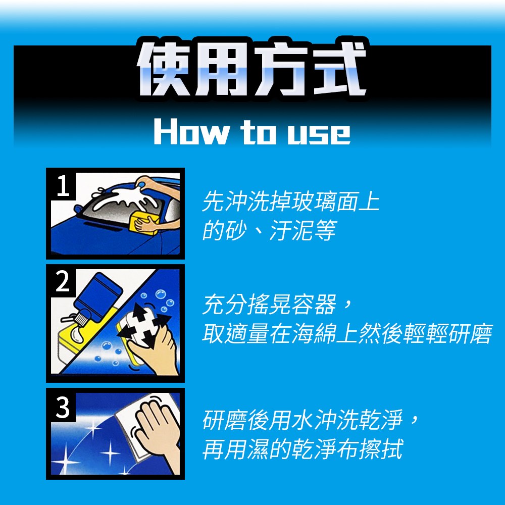 ▸採用三種不同粒徑研磨劑配方,有效瓦解頑固油膜與殘留玻璃鍍膜劑