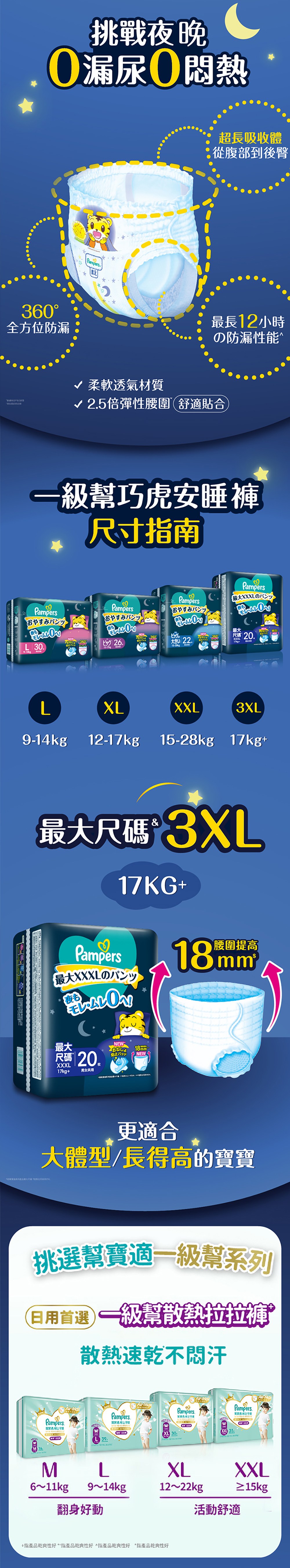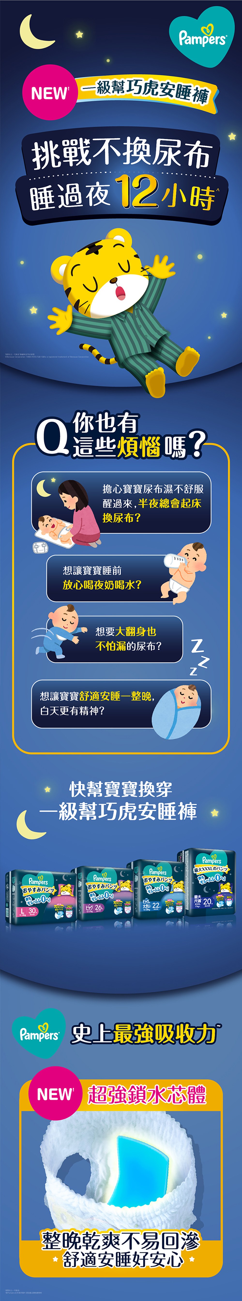 - 全新升級幫寶適安睡褲,整夜舒適乾爽,讓寶寶享受甜美夢境,媽媽安心整晚。