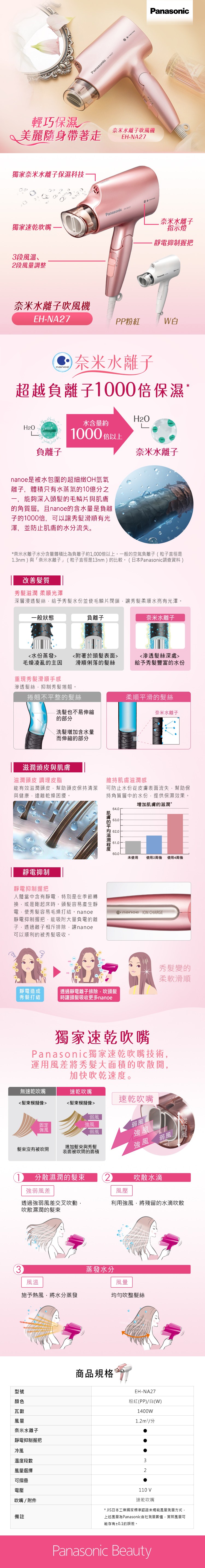 Panasonic 國際牌 EH-NA27-PP 奈米吹風機,以其獨特的奈米水離子技術,為您的秀髮帶來前所未有的呵護。這款粉色吹風機不僅外型時尚,更擁有1400W的功率,能快速吹乾頭髮,節省您的寶貴時間。它具備兩段風量和三段溫度調節,適合所有髮質,讓您輕鬆打造理想髮型。可折疊設計使其輕巧便攜,非常適合家庭使用和旅行。集中吹嘴設計,讓您更精準地控制風向,塑造更完美的造型。