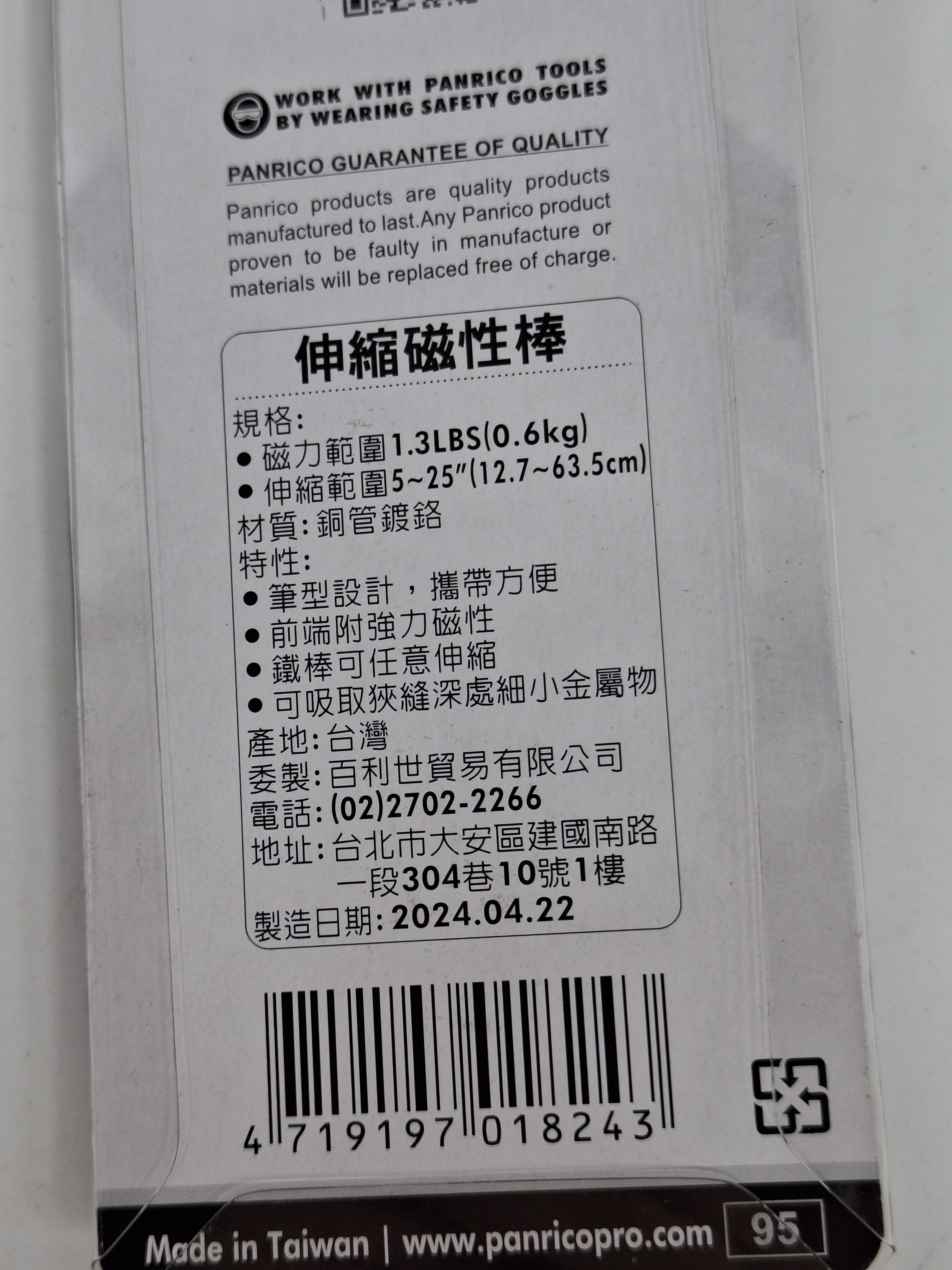 Panrico 百利世伸縮磁性棒是您在狹窄空間或難以觸及的地方尋找遺失金屬物品的理想工具。這款伸縮棒採用筆型設計,方便攜帶,可從12.7公分延伸至63.5公分,讓您輕鬆撿拾螺絲、螺帽、鑰匙等小物件。前端附有強力磁性,可吸取重達0.6公斤的物品。無論是在汽車維修、家庭修繕或工廠作業,這款磁性棒都能成為您的得力助手。Panrico 百利世伸縮磁性棒台灣製造,品質保證。