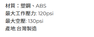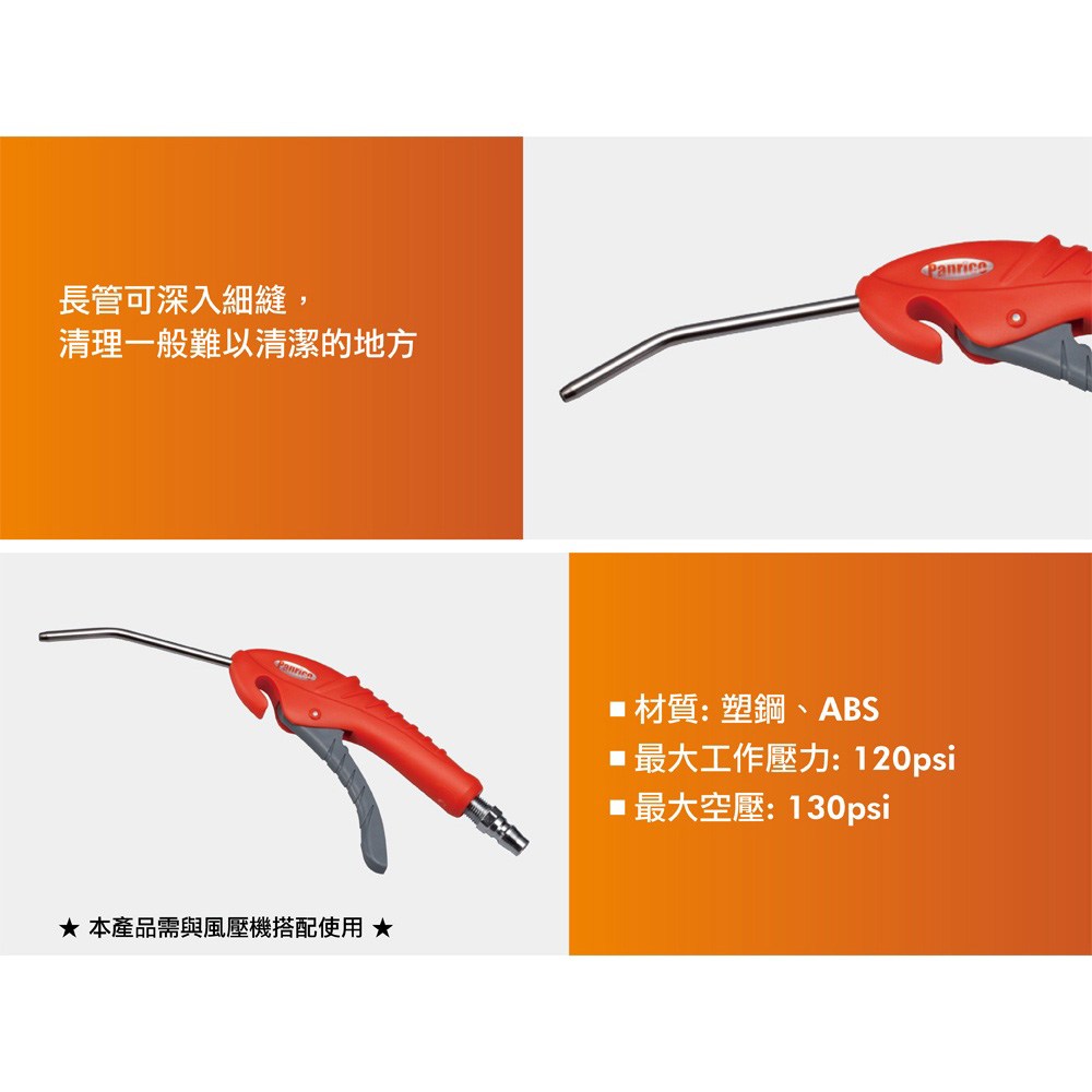 Panrico 百利世 台灣製空氣噴槍是您清潔工作的好幫手。這款4吋噴槍採用耐用的塑鋼和ABS材質製成,確保產品的堅固耐用。其最大工作壓力為120psi,最大空壓為130psi,能提供強勁的氣流,輕鬆吹走灰塵和碎屑。長管設計能深入細縫,清潔一般難以觸及的地方。台灣製造,品質保證,讓您買得安心,用得放心。