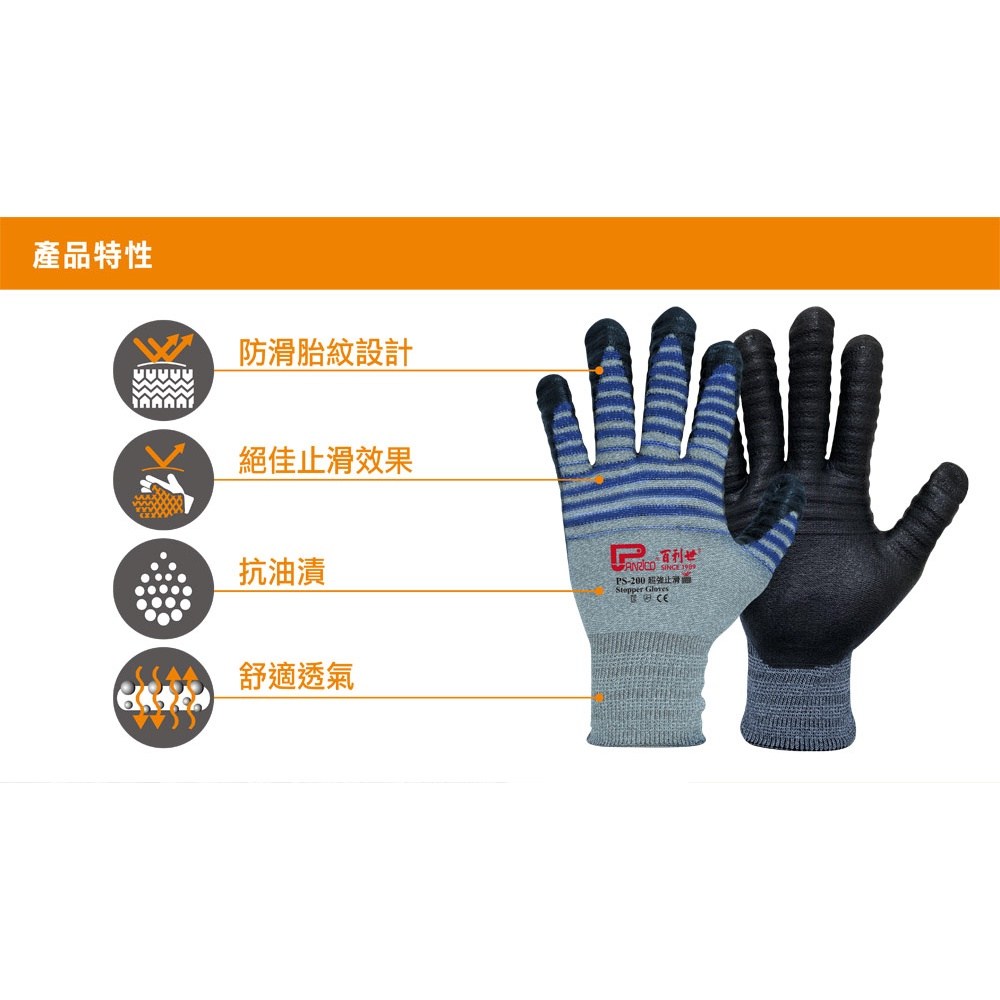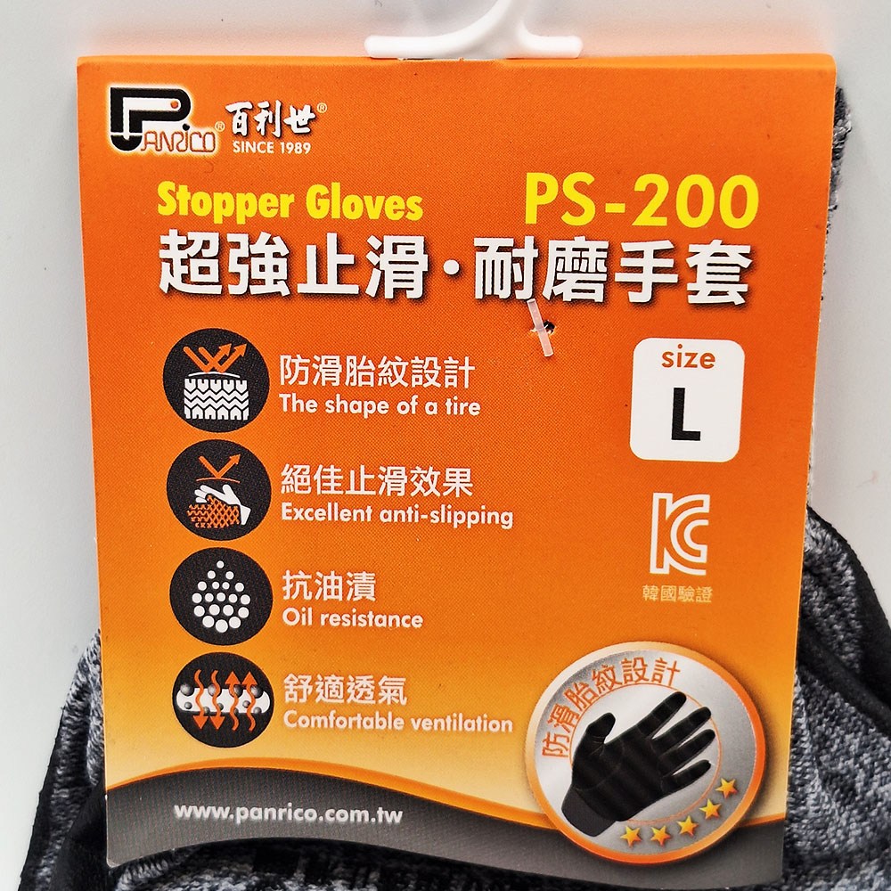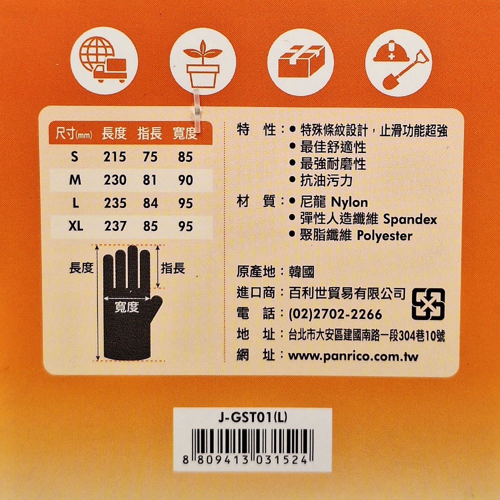 Panrico 百利世 J-GST01 超強止滑耐磨手套。採用尼龍、彈性人造纖維與聚酯纖維混紡製成,L 尺寸(23.5 x 8.4 x 9.5cm)設計,兼具耐磨、止滑與舒適透氣性。胎紋設計提供超強止滑效果,即使在油污環境下也能保持穩定的抓握力,讓您在工作或 DIY 項目中更加安全可靠。一雙入,可重複使用。