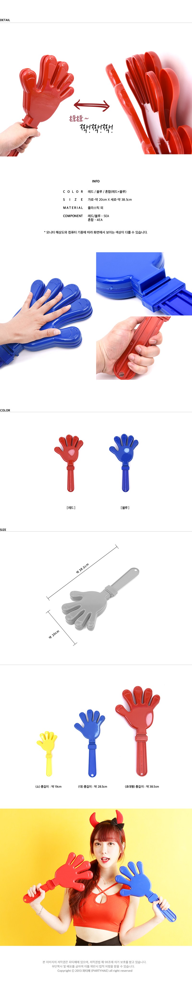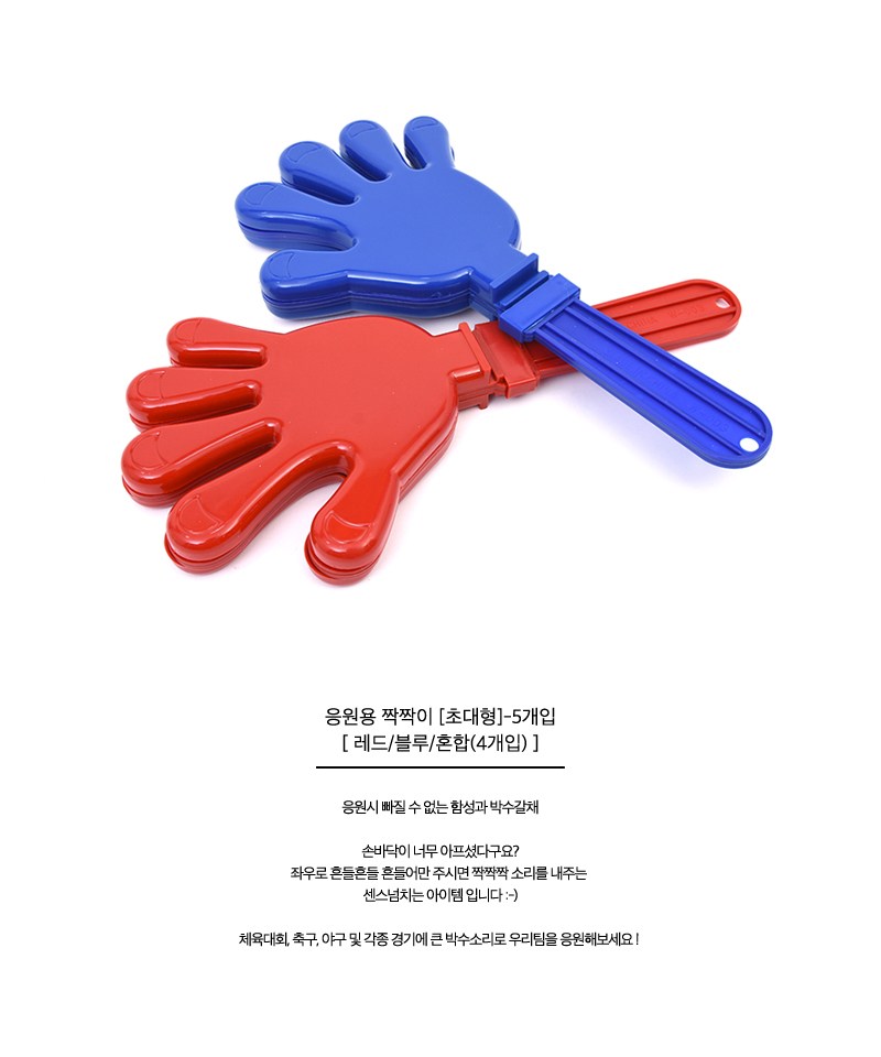 - 超大型拍手器,尺寸為20 x 38.5公分,讓您在啦啦隊應援時更加引人注目,輕鬆炒熱現場氣氛。