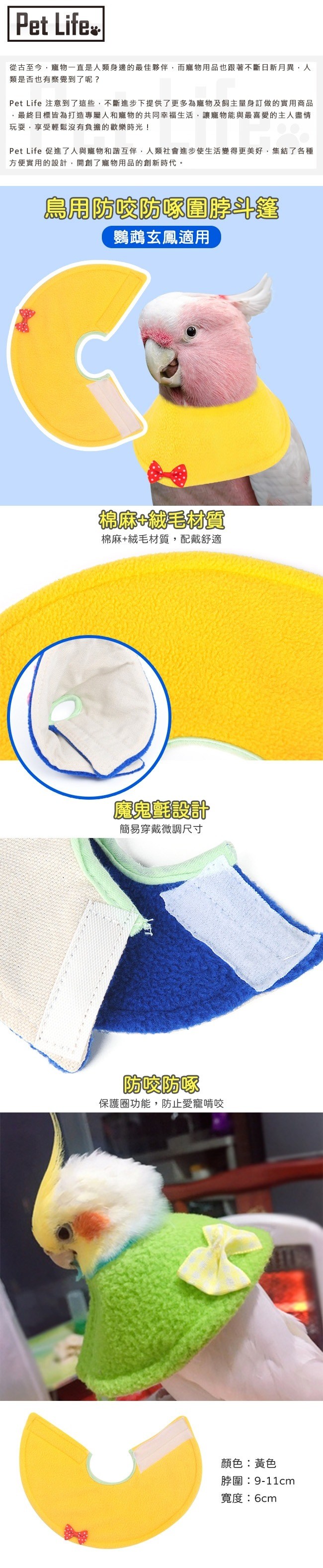 Pet Life 鳥用伊麗莎白圈是專為鸚鵡和玄鳳等鳥類設計的防咬防啄保護圈,幫助牠們更快康復。採用柔軟的棉麻材質,確保鳥寶配戴時的舒適度,減少不適感。魔鬼氈設計方便穿脫,可根據鳥寶的頸圍調整鬆緊,提供更佳的保護效果。讓您的愛鳥在安全舒適的環境下恢復健康,同時兼顧美觀。