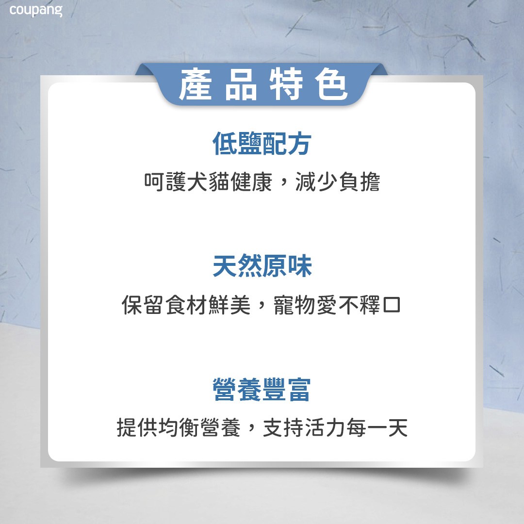 - 低鹽配方設計,減少寵物腎臟負擔,讓您的愛寵可以安心享用美味。