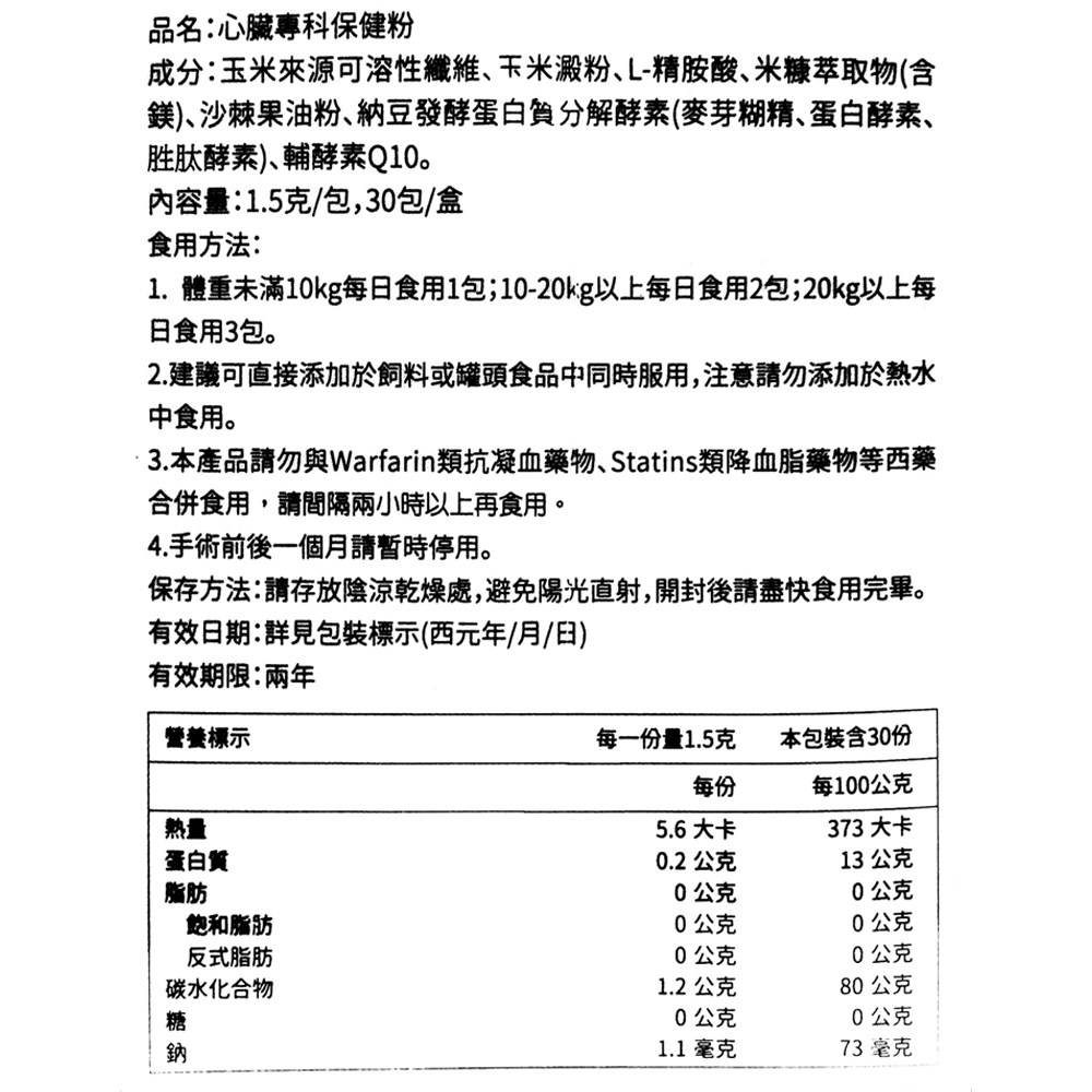 - - 專為毛孩設計的心臟保健配方,讓您的愛犬或愛貓每天都充滿活力與健康。