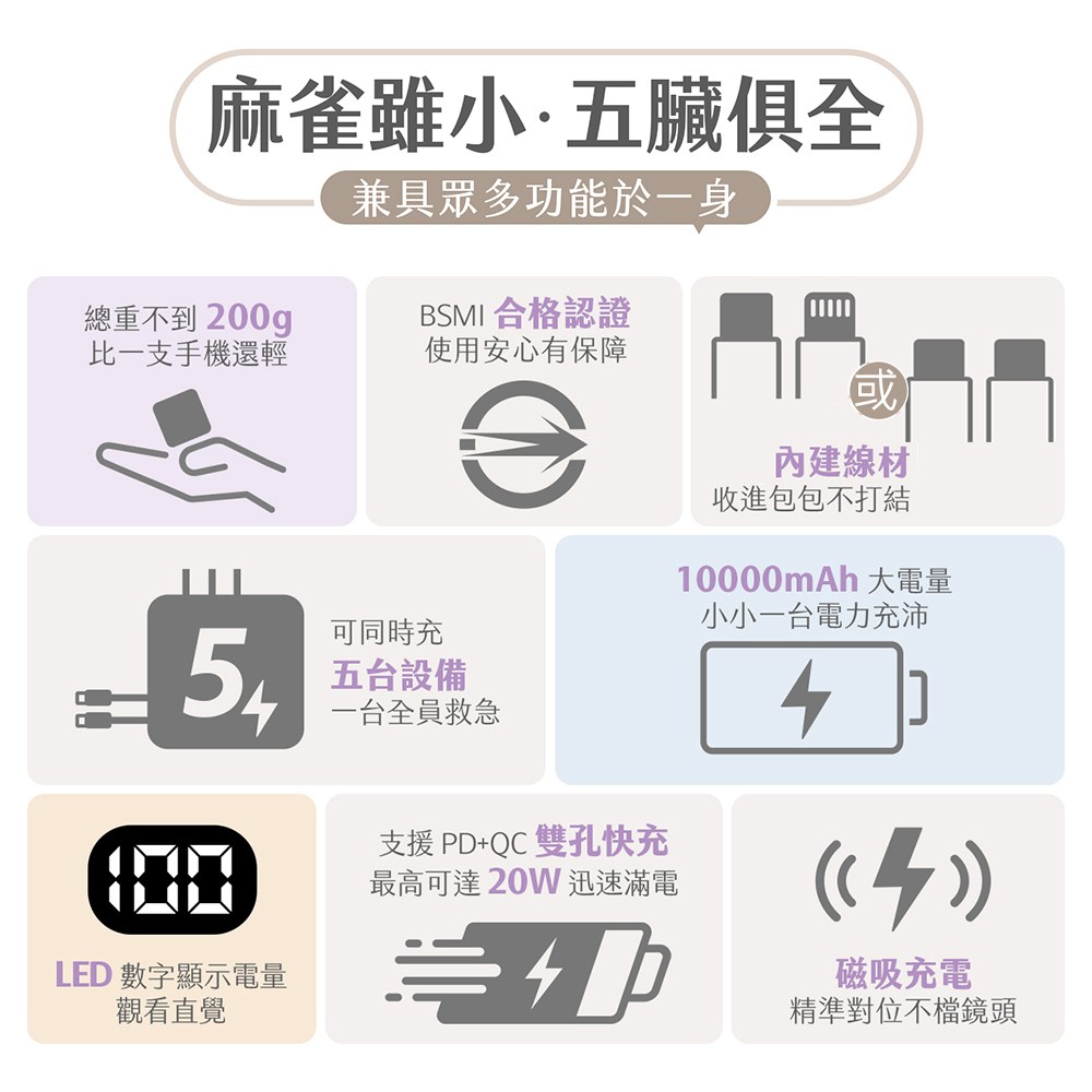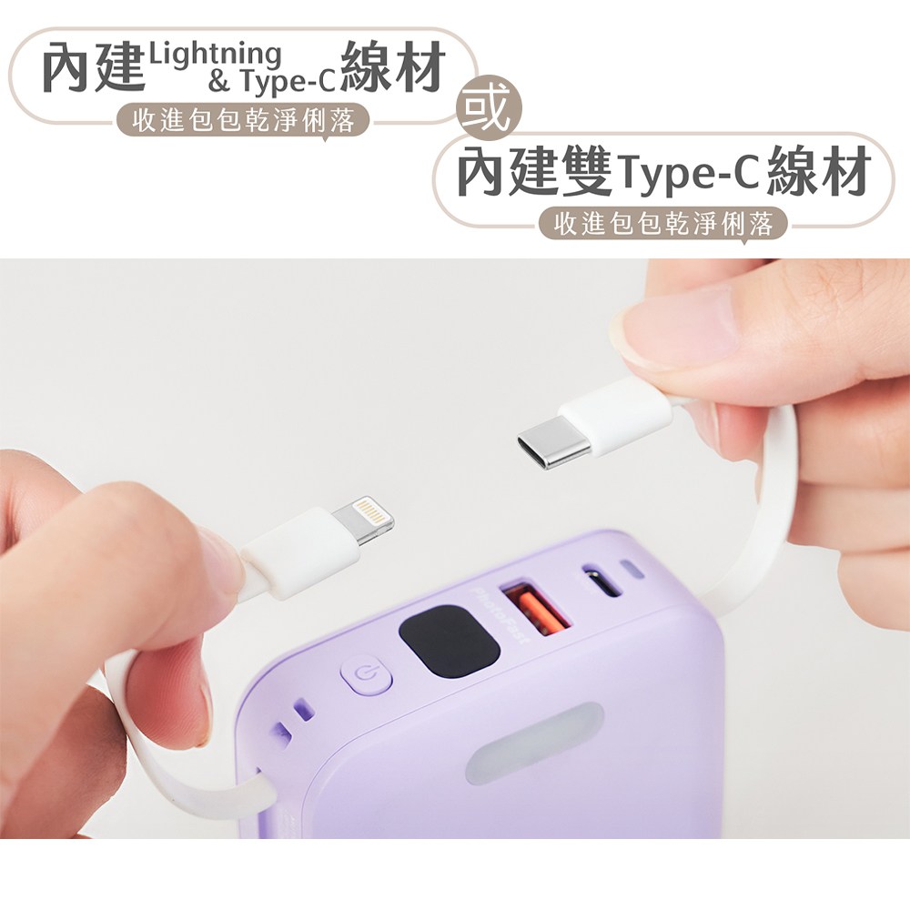 - 迷你五合一設計,內建Type-C和Lightning充電線,告別線材纏繞煩惱,輕鬆應對各種充電需求。