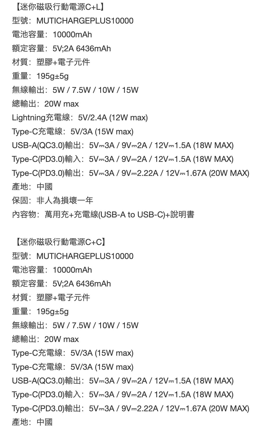 - 10000mAh大容量,總重不到200g,輕巧便攜,隨時隨地提供手機、平板等設備充足電力。