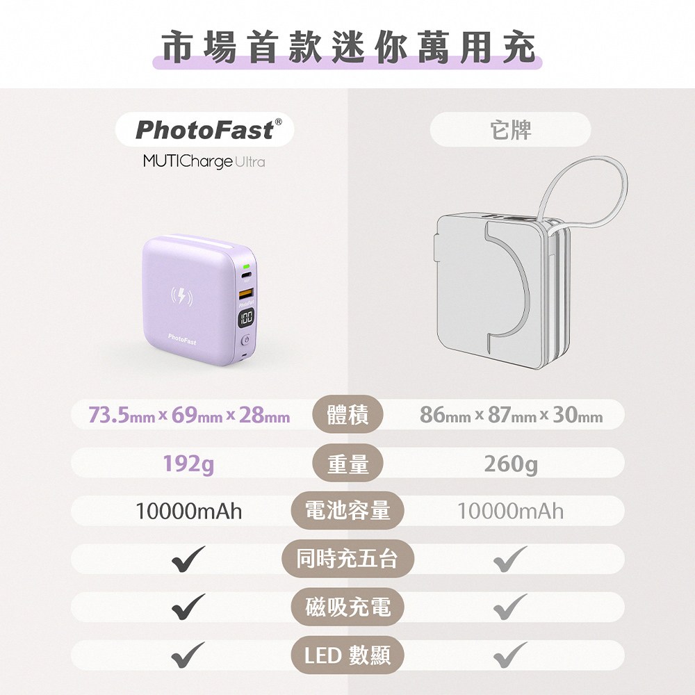PhotoFast MUTICharge Ultra 萬用充五合一磁吸行動電源,是一款集多功能於一身的迷你充電神器。它內建Type-C和Lightning充電線,告別了傳統行動電源需要額外攜帶充電線的麻煩。10000mAh的大容量,足以應付日常所需,而其輕巧的設計,讓您輕鬆放入口袋或包包中。此外,它還支援PD+QC雙孔快充,能夠快速為您的設備充電,節省您的寶貴時間。磁吸無線充電功能,讓充電更加便捷,精準對位,不阻擋鏡頭。