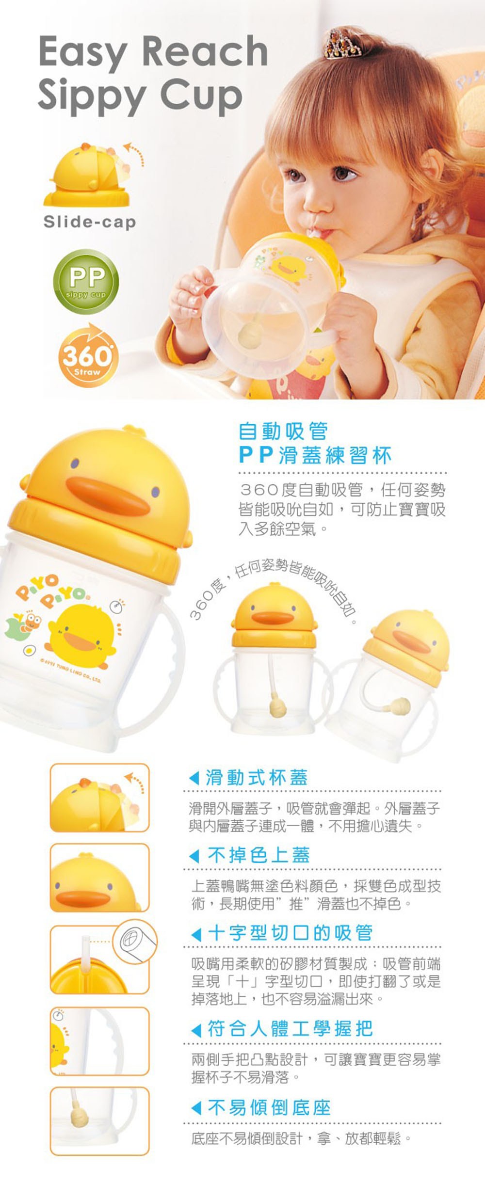 - - 黃色小鴨造型,色彩鮮明活潑,讓寶寶愛不釋手,增加喝水樂趣。