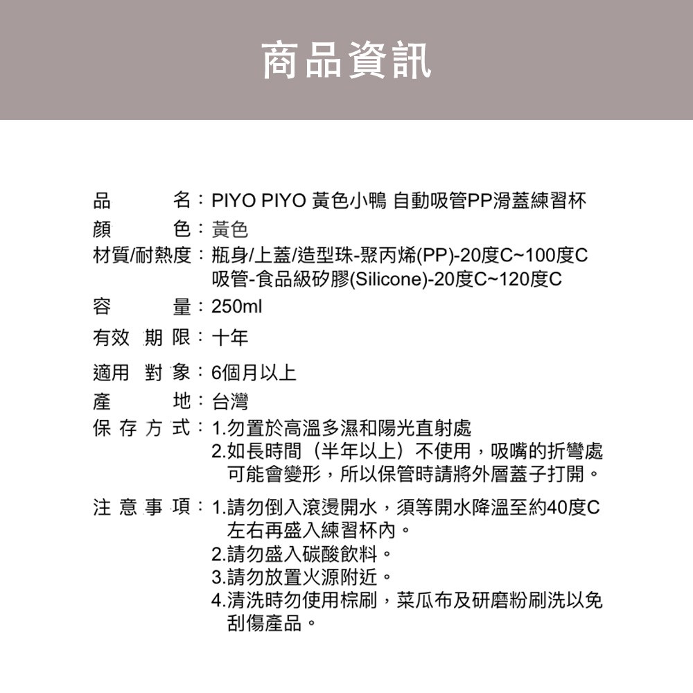 - 嬰兒用品材質: 瓶身/上蓋/造型珠:聚丙烯(PP)/-20℃~100℃ 吸管:食品級矽膠(Silicone)/-20℃~100℃