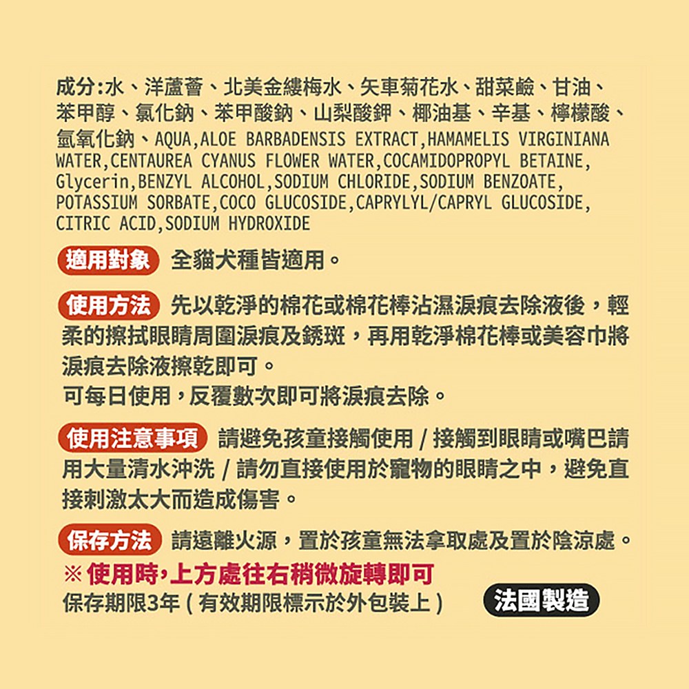 - 溫和清潔配方,能有效舒緩寵物眼周不適,讓毛孩享受舒適的清潔體驗。