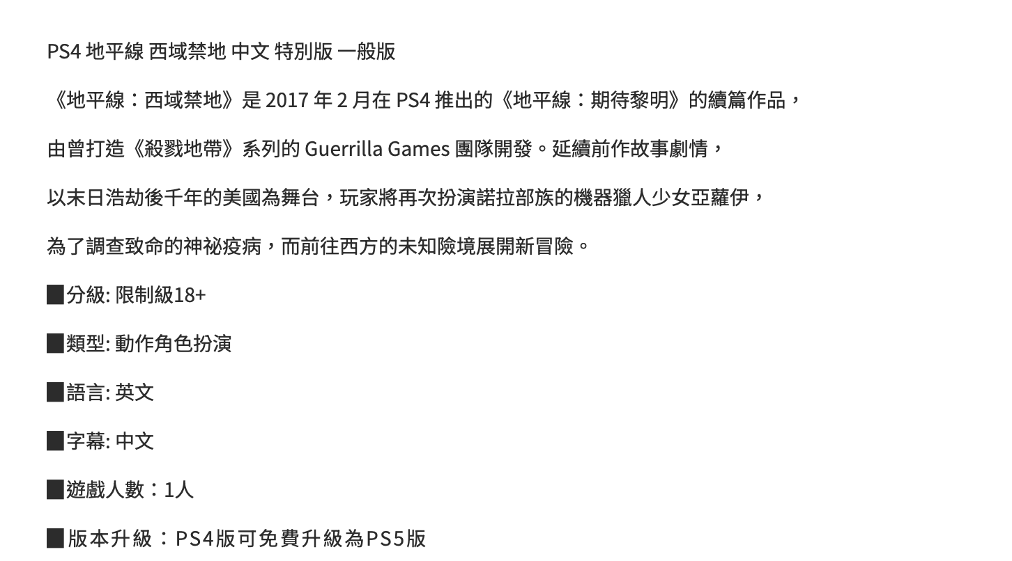 《地平線 西域禁地》PS4 中文一般版,帶領玩家進入末日浩劫後千年的美國西部,再次扮演諾拉族機器獵人少女亞蘿伊,探索致命的神秘疫病。Guerrilla Games 團隊延續前作故事劇情,打造出令人驚豔的開放世界動作角色扮演遊戲。此版本為PS4一般版,提供中文介面與字幕,讓玩家沉浸於豐富的劇情與刺激的戰鬥中。遊戲支援單人遊玩,適合18歲以上玩家體驗。此外,購買PS4版本可免費升級為PS5版本,享受更優質的遊戲體驗。
