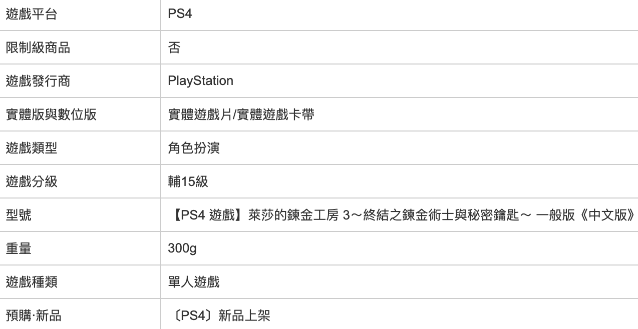 《萊莎的鍊金工房3 終結之鍊金術士與秘密鑰匙》PS4一般中文版,帶領玩家進入萊莎冒險的最終章。作為一款角色扮演遊戲,本作延續了鍊金工房系列的經典玩法,玩家將扮演萊莎探索神秘的鑰匙,解開隱藏的秘密。遊戲畫面精美,戰鬥系統刺激,讓玩家沉浸在奇幻的世界中。此版本為PS4實體遊戲,適合喜歡單人遊戲的玩家。現在就加入萊莎的行列,一起展開這場終結的鍊金術之旅吧!