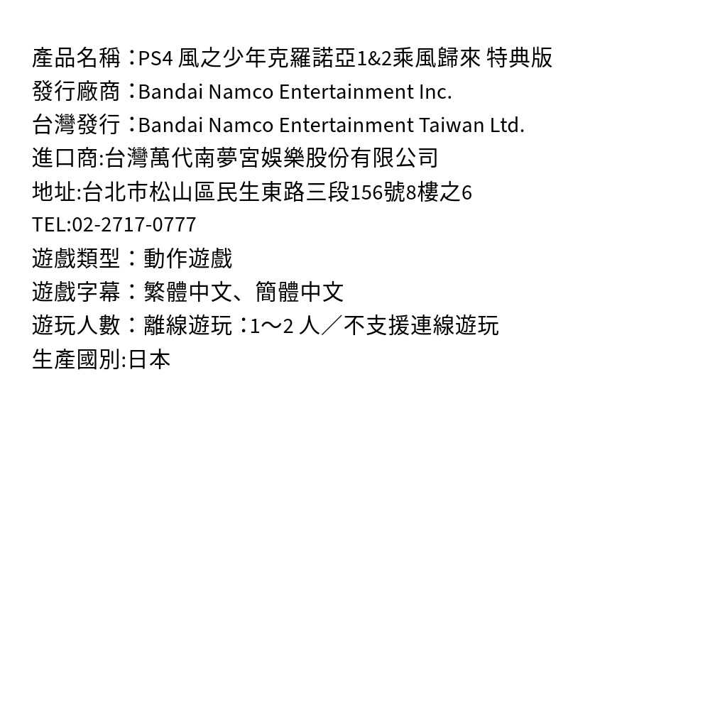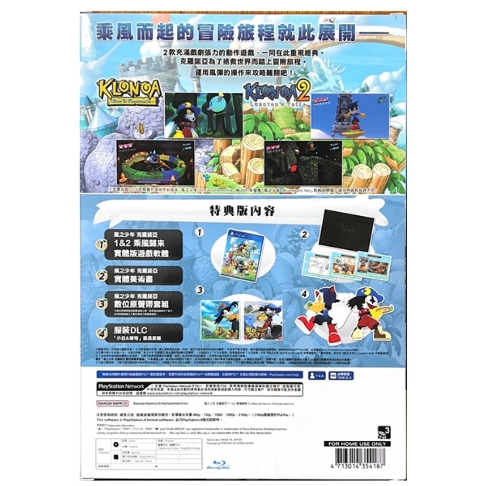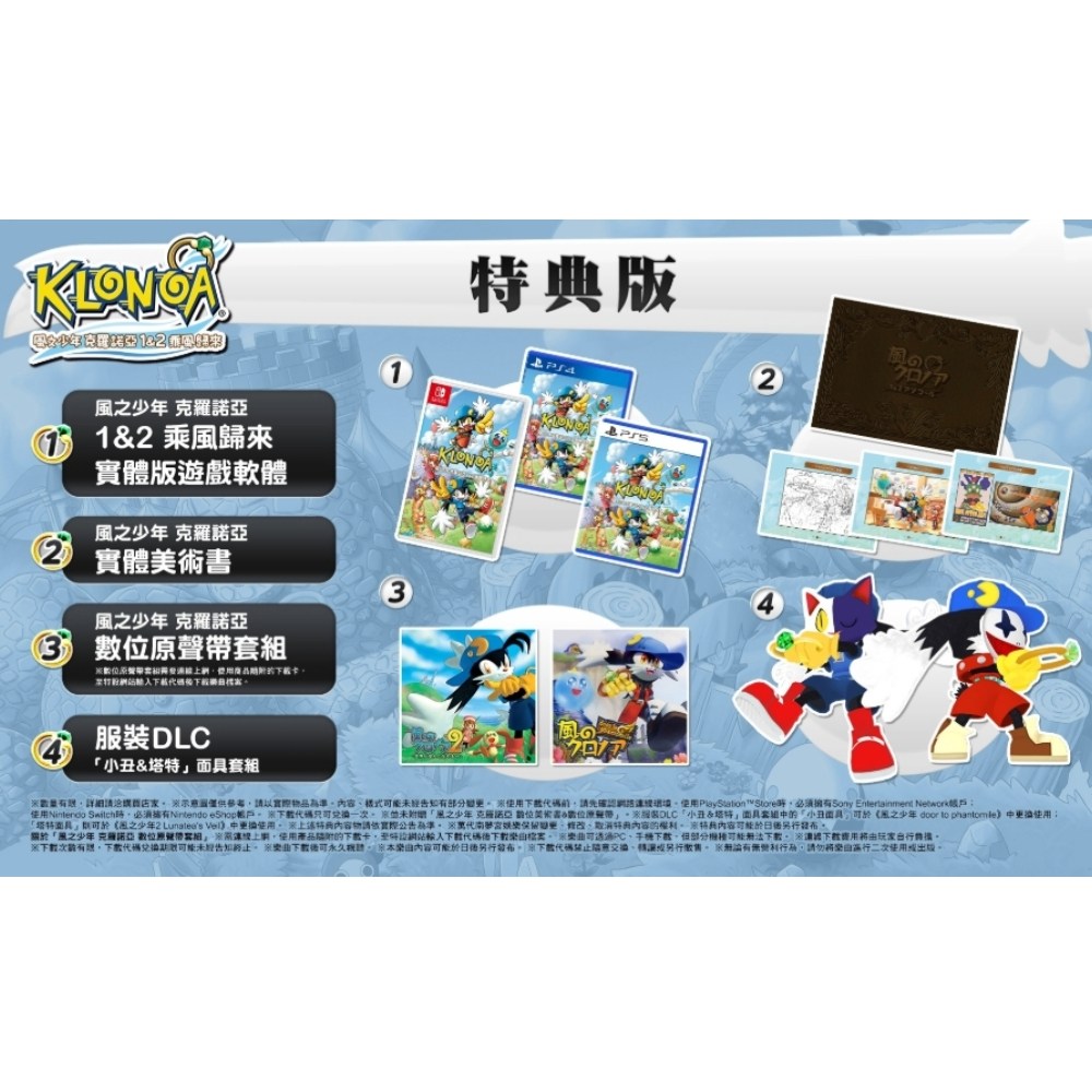 《風之少年克羅諾亞 1&2 乘風歸來》特典版,讓您一次體驗兩款經典動作遊戲的魅力。克羅諾亞將為了拯救世界而踏上冒險旅程,玩家可運用獨特的風彈操作來攻略各種難關。特典版除了實體遊戲軟體外,更包含精美的實體美術書與數位原聲帶套組,讓您在遊戲之外也能享受視覺與聽覺的饗宴。服裝DLC「小丑&塔特」面具套組,為您的冒險增添更多樂趣。現在就加入克羅諾亞的行列,一同乘風而起,重溫童年時光。