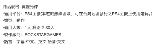 準備好在《俠盜獵車手 5》豪華線上版中體驗終極娛樂。這款 PS4 遊戲提供中英多國語言版本,讓您沉浸在洛聖都和布萊恩郡的開放世界中。豪華線上版包含完整的《俠盜獵車手 5》故事模式、不斷演進的《俠盜獵車手 Online》以及所有現有遊戲升級和內容,包括末日搶劫、軍火走私、走私販大進擊、飛車黨等等,其中包含最受歡迎的房地產、企業、武器和車輛,總價值超過 1,000 萬 GTA 遊戲幣。立即加入這個充滿活力和不斷擴展的世界,體驗無盡的遊戲樂趣和刺激。