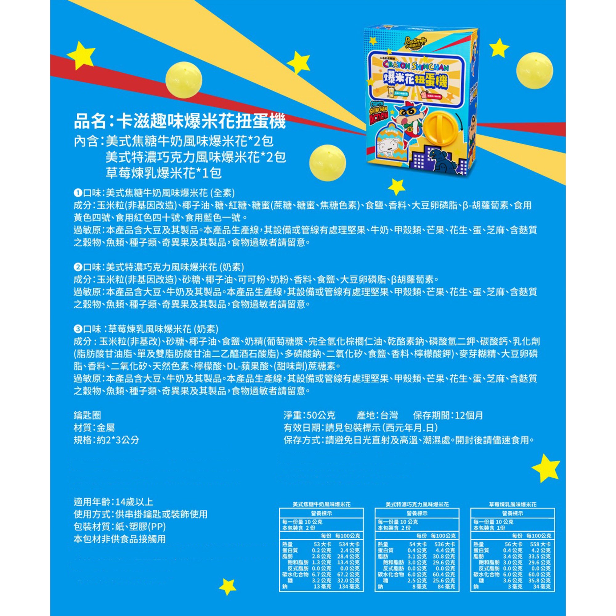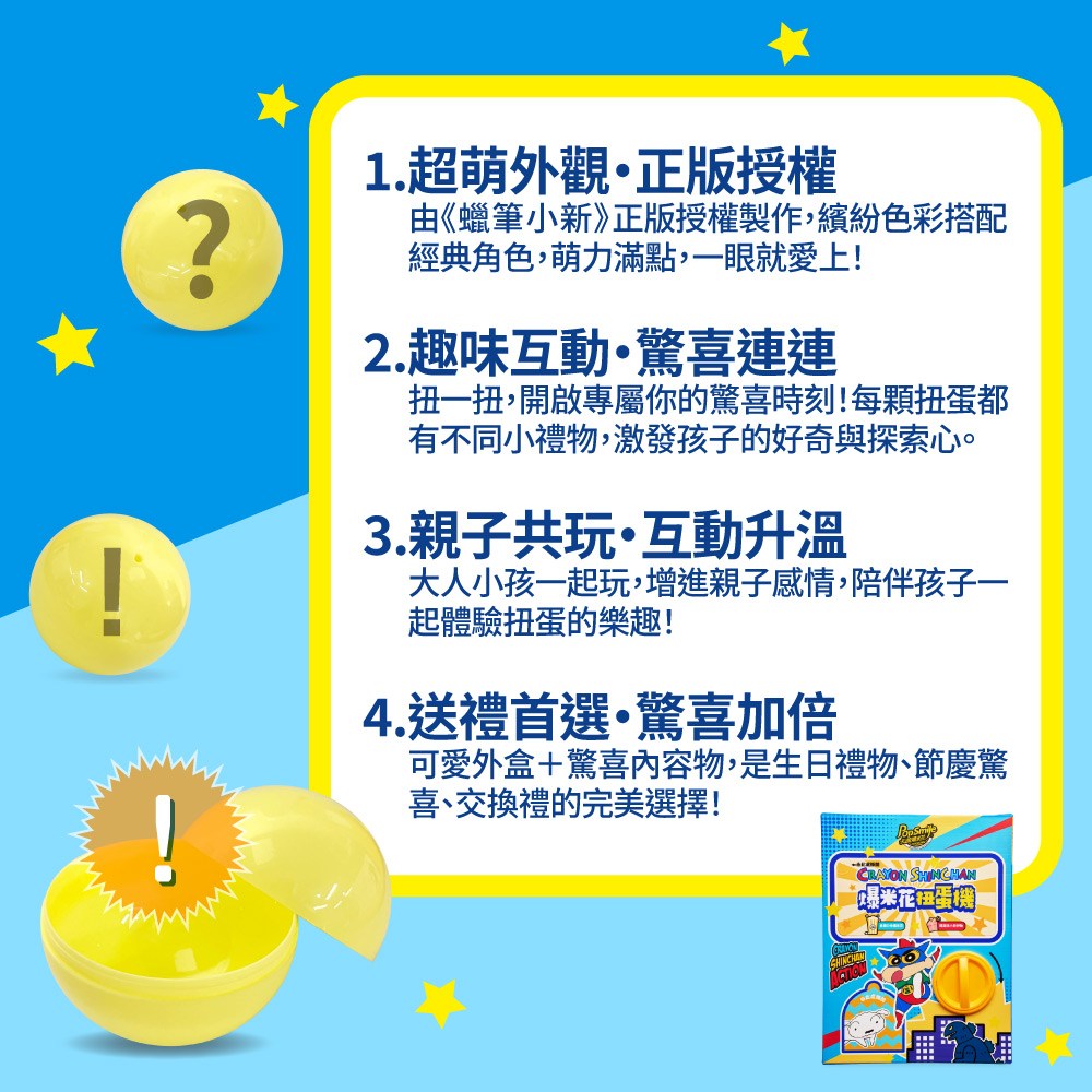 卡滋蠟筆小新爆米花趣味扭蛋機,是一款結合美味零食與趣味玩具的產品。扭蛋機內含多種口味的卡滋爆米花,讓孩子們可以一次品嚐到不同的美味。此外,扭蛋中還隱藏著驚喜小禮物,每次扭蛋都有不同的發現,增添了零食的樂趣與期待感。這款產品不僅美味,還能促進親子互動,讓全家一起享受歡樂時光。可愛的蠟筆小新造型,更是讓孩子們愛不釋手。