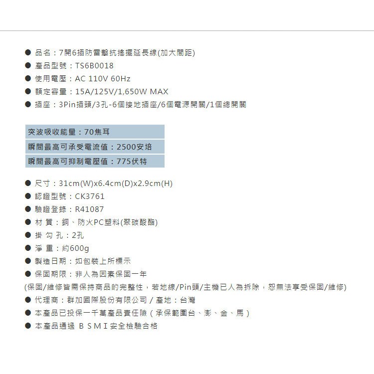 這款7開6插防雷擊抗搖擺延長用電源線組,型號TS6B0018,線長1.8米,是您居家或辦公室用電安全的可靠選擇。其專利抗搖擺插頭設計,能有效緩衝拉力,保護線身不易受損,延長使用壽命。每個插座皆配有獨立開關,方便您隨時控制用電,節省能源。此外,斜面插座加大間距設計,讓您即使使用較大型的變壓器,也不會互相干擾。此電源線組具備防雷擊抗突波功能,能吸收異常電壓,保護您的電器產品免受損害,額定容量高達1650W,讓您安心使用。