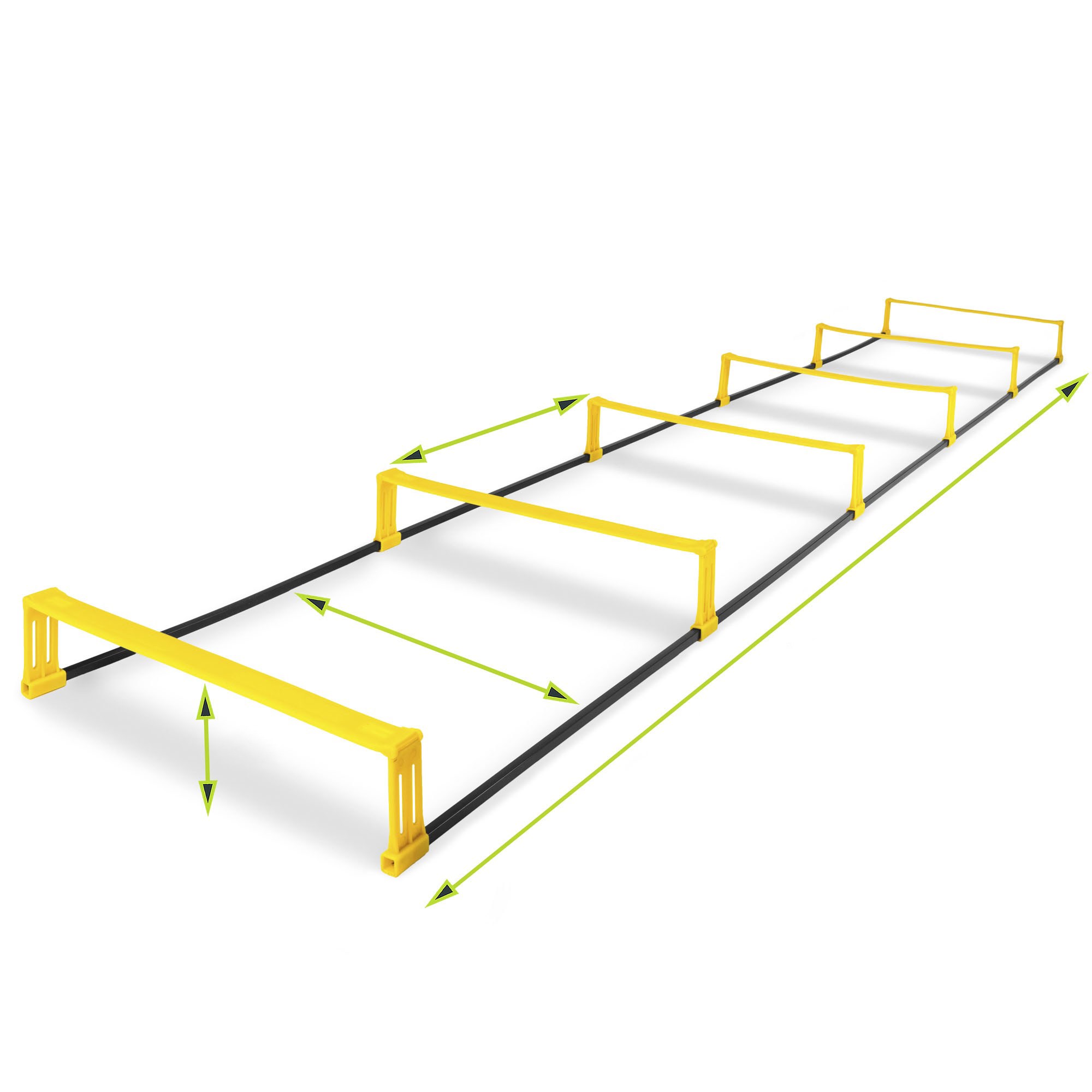 축구, 농구에서 반응 시간, 발놀림, 조정력을 향상시키는 데 도움을 주는 스피드 사다리입니다. 평평한 민첩성 사다리 또는 고속 사다리로 다양하게 설계하여 훈련할 수 있습니다. 높이 8.9cm의 가로대는 더 격렬한 운동을 위한 도전력을 더해줍니다. 가로대부터 허들까지 완전히 접을 수 있어 보관이 용이합니다. 모래, 잔디, 콘크리트 등 실내외 훈련에 최적화된 제품입니다. 접어서 운반용 가방에 넣으면 휴대가 편리합니다. 훈련 중 견고성을 위해 내구성이 뛰어난 플라스틱으로 만들었습니다. 장비가 손상될 염려가 없는 젖은 잔디, 모래, 또는 물에서 훈련하기 좋습니다. 운동 중 발을 헛디뎌도 안정감을 유지합니다.