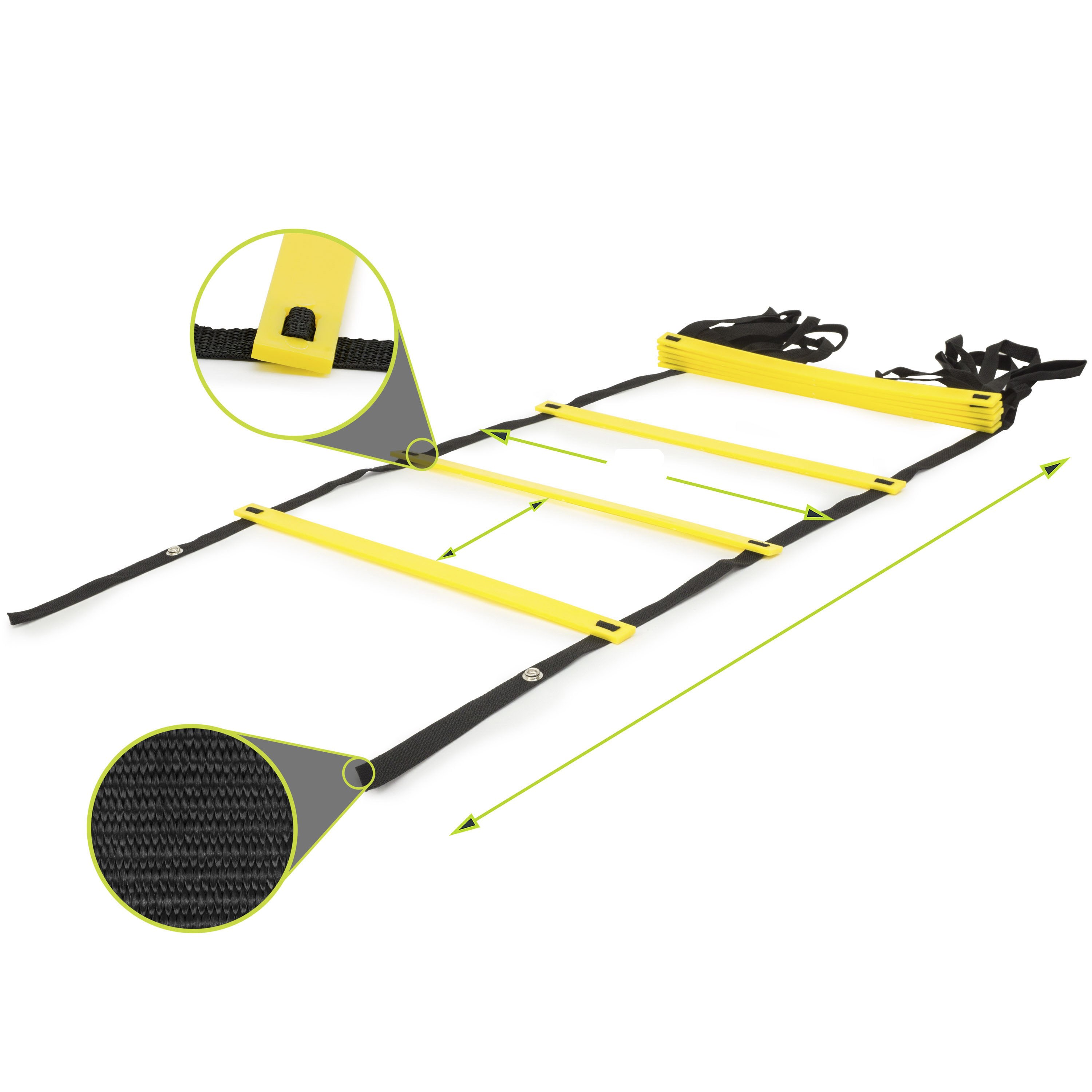 조정력, 발놀림, 속도, 민첩성, 균형과 같은 운동 성능을 향상시키는 데 도움을 주는 스피드 사다리입니다. 활동적인 어린이, 운동선수에게 적합하며, 노인들이 균형과 이동성을 유지하는 데에도 도움을 줍니다. 민첩성 훈련으로 체력을 높이고 칼로리를 불태워 체중을 줄이는 재미있는 방법을 제공합니다. 3가지 길이로 제공되며, 조절 가능한 납작한 가로대가 포함되어 있습니다. 편리한 휴대용 케이스가 포함되어 있습니다. 콤팩트한 디자인으로 가볍게 말아서 공원, 해변, 체육관에 가지고 갈 수 있습니다.