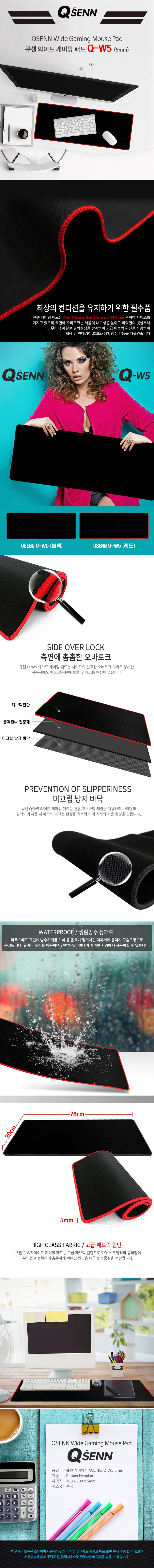 QSENN 寬版遊戲滑鼠墊 Q-W5 擁有寬敞的 78 公分 x 30 公分尺寸,厚度為 5 毫米,提供舒適的使用體驗。側邊採用緊密的鎖邊處理,防止邊緣磨損,經久耐用。滑鼠墊表面具有生活防水功能,不小心潑灑水或飲料時,只需輕輕擦拭即可。底部採用天然橡膠材質,能牢牢固定在桌面上,防止滑動。高級布料表面確保滑鼠移動的精準度和流暢度,提升您的遊戲或工作效率。
