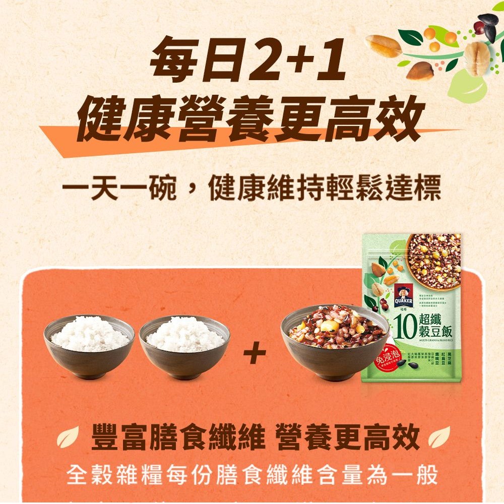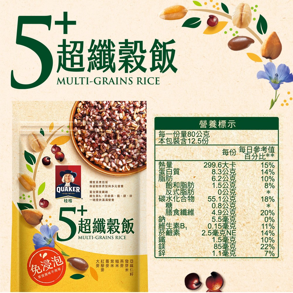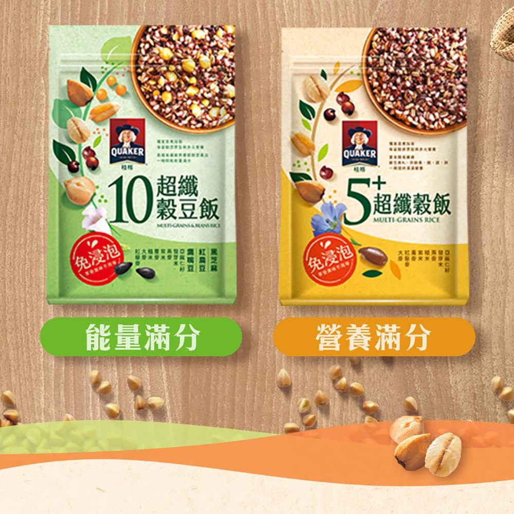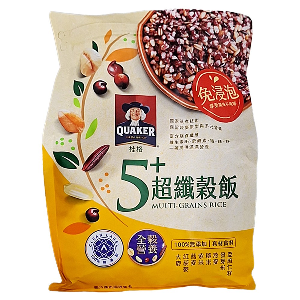 QUAKER 桂格 桂格5+超纖穀飯,是您健康飲食的理想選擇,富含膳食纖維,有助於促進腸道蠕動,維持消化系統健康。免浸泡設計,省時方便,讓您輕鬆享受美味又營養的一餐。桂格品牌值得信賴,品質保證,讓您吃得安心。每包含有1000g,適合全家大小一同享用,為您的健康加分。