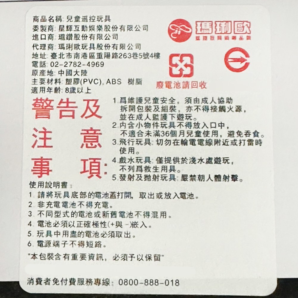 | 國內製造商或負責商名稱 | 瑪琍歐玩具股份有限公司 | 原產地/國 | 中國大陸 |