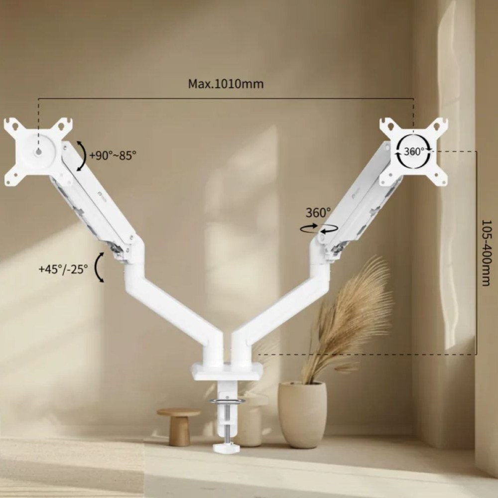 【Raymii 瑞米】VS-88 氣壓式雙螢幕支架,採用優質鋁合金與塑料外殼,堅固耐用且外觀時尚。這款白色支架適用於19-32吋螢幕,能有效節省桌面空間,提供更舒適的工作環境。其雙氣壓懸臂設計,讓每個螢幕都能獨立升降、旋轉、前後移動及俯仰,輕鬆調整至最佳視角。無論是辦公或娛樂,都能享受更彈性、更符合人體工學的使用體驗。一年原廠品質保證,讓您安心使用。