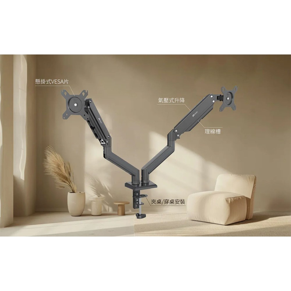 - 氣壓懸臂設計,節省桌面空間,工作區域更寬敞整潔。
