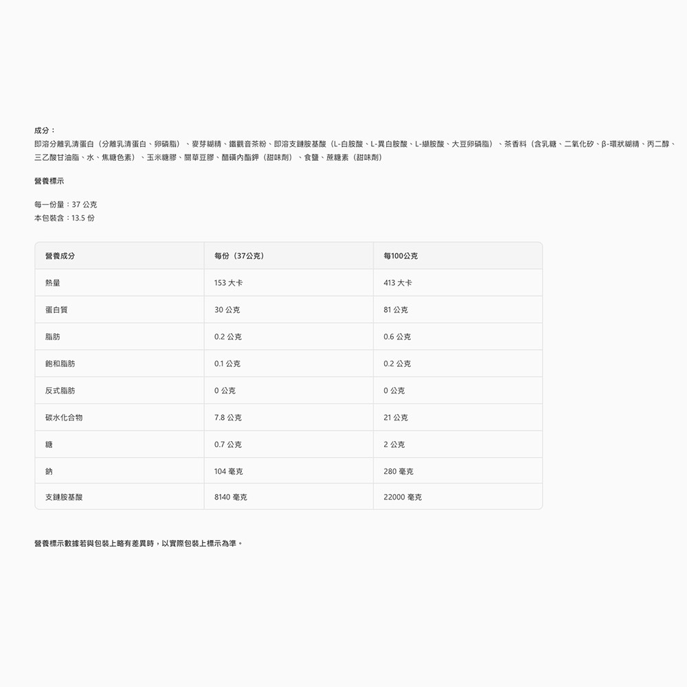 | 投保產品責任險字號 | 10402523520 | 成分 | 即溶分離乳清蛋白(分離乳清蛋白、卵磷脂)、麥芽糊精、鐵觀音茶粉,即溶支鏈胺基酸(L-白胺酸、L-異白胺酸、L-纈胺酸、大豆卵磷脂)、茶香料(含乳糖、二氧化矽、β-環狀糊精、丙二醇、三乙酸甘油脂、水、焦糖色素)、玉米糖膠、關華豆膠、醋磺內酯鉀(甜味劑)、食鹽、蔗糖素(甜味劑) |