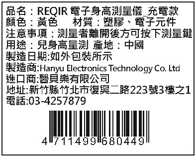 REQIR 電子身高測量儀充電款,黃色,是一款精準且方便的數位身高測量工具。採用充電式設計,告別頻繁更換電池的煩惱。此款測量儀操作簡單,只需輕輕一按,即可快速測量身高,無論是追蹤兒童成長,還是成人日常測量,都非常適合。黃色外觀設計,時尚醒目,為您的健康管理增添一份色彩。精確的測量結果,讓您隨時掌握身高變化,更好地關注自身健康。