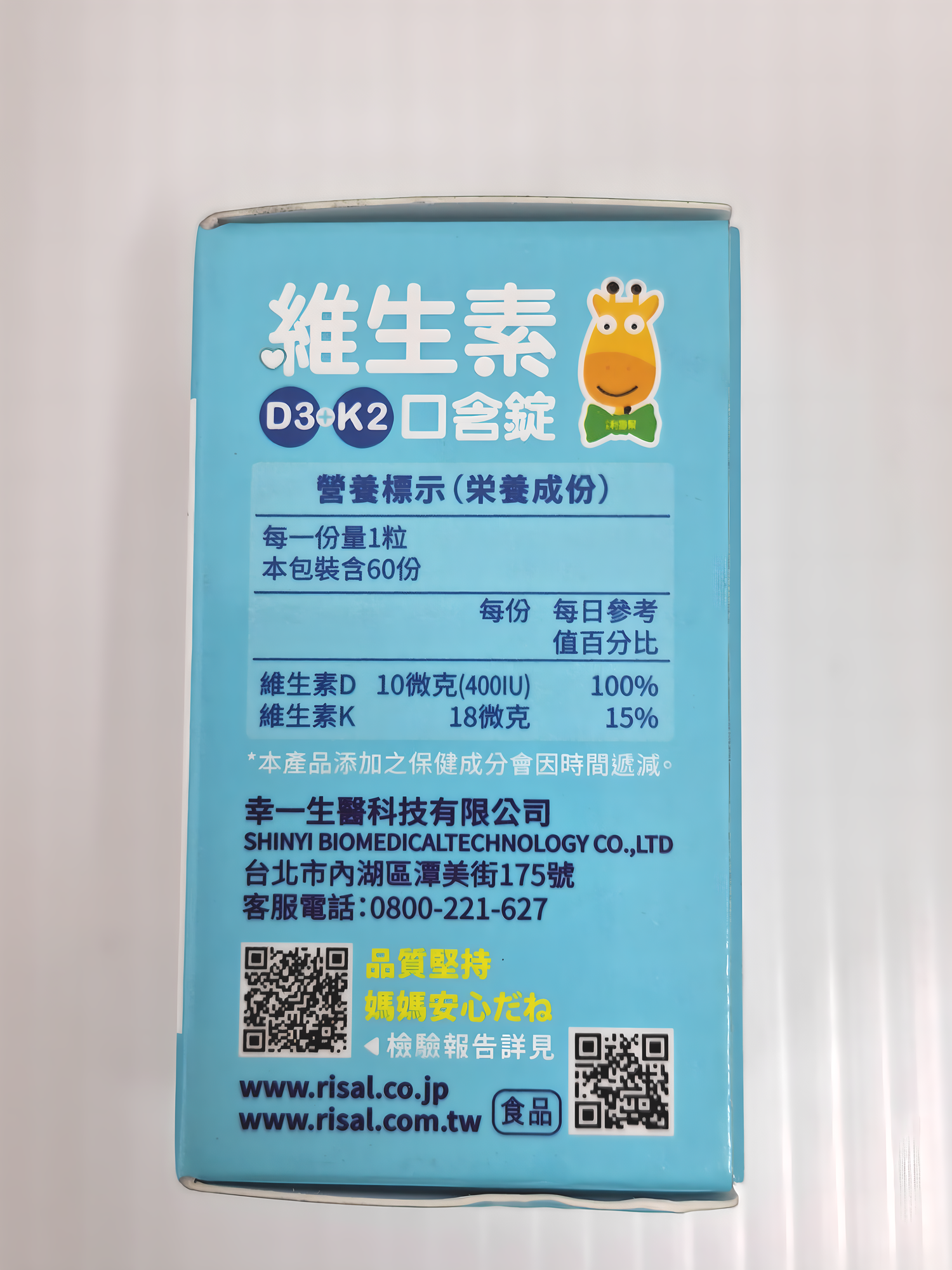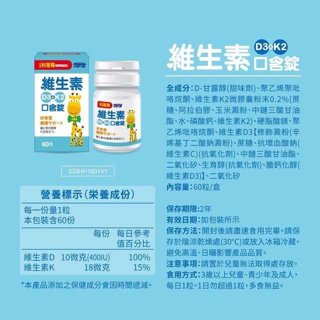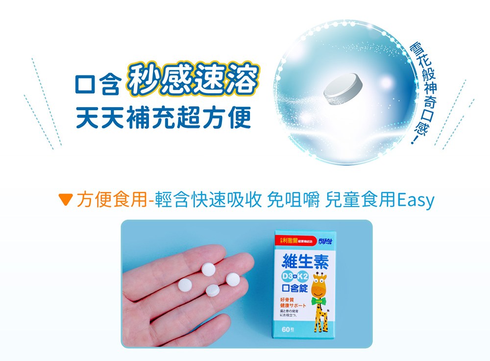 - 小兒利撒爾D3+K2口含錠,口感極佳,讓孩子每天都期待補充營養,健康成長。