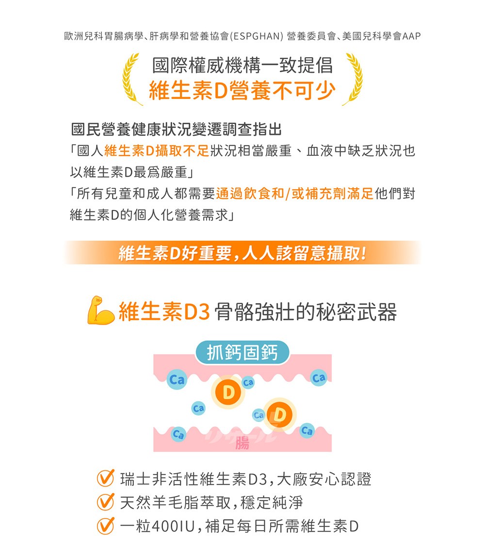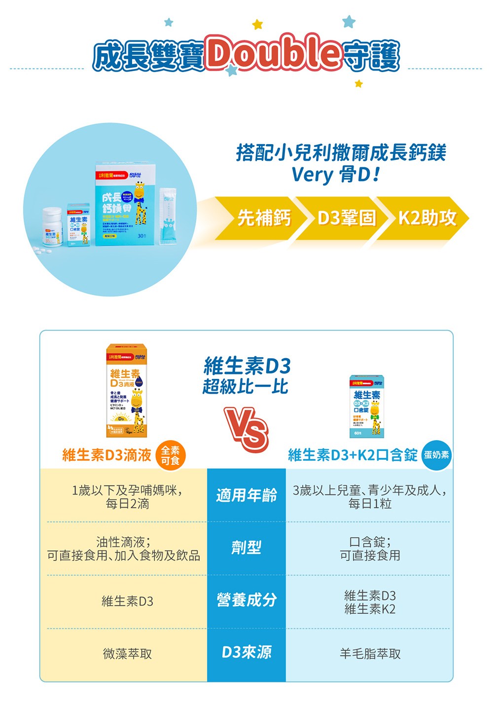 - 維生素D3有助於鈣質吸收,搭配K2促進骨骼健康,讓孩子們的骨骼發展更上一層樓。