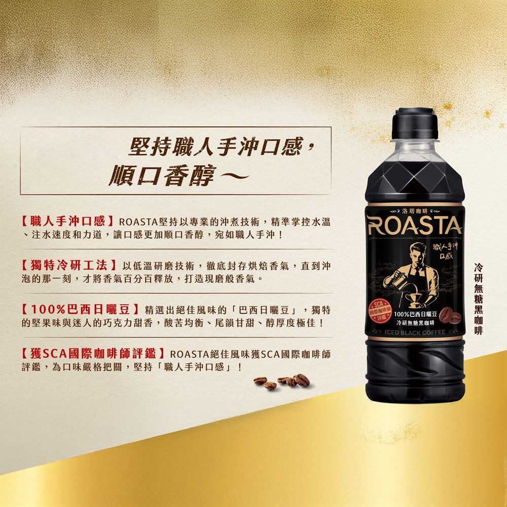 ROASTA 冷研無糖黑咖啡,讓您隨時享受精品級的咖啡體驗。這款即飲黑咖啡採用100%精選巴西咖啡豆,經過淺焙工藝,保留了咖啡豆最原始的風味。每箱包含24瓶455ml的塑膠瓶裝咖啡,方便您隨時隨地補充能量。無糖配方,讓您享受純粹的咖啡香醇,無負擔。無論是工作、學習還是休閒,ROASTA冷研無糖黑咖啡都是您的理想選擇。快速到貨,讓您隨時享受美味!
