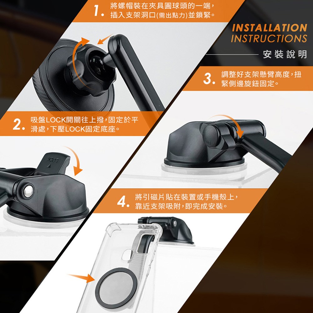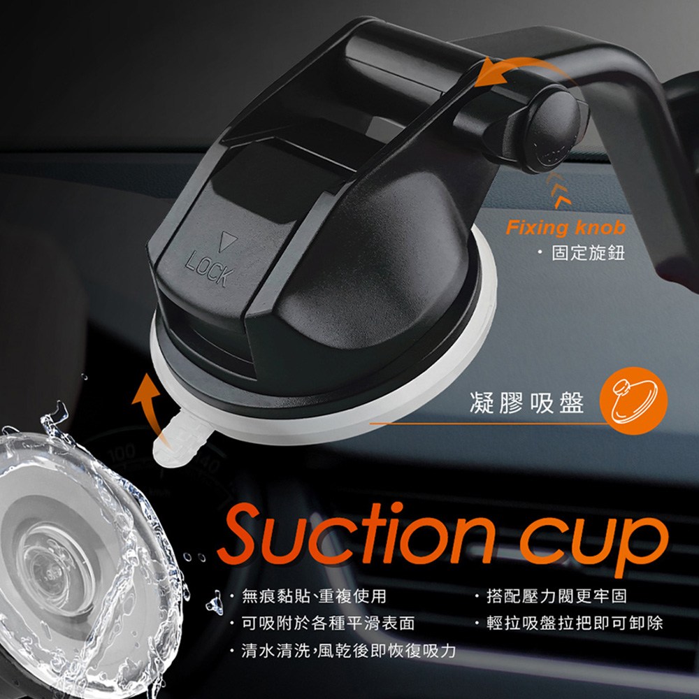 - 凝膠吸盤穩固吸附於儀表板,耐高溫不變形,讓手機在行車過程中穩如泰山。