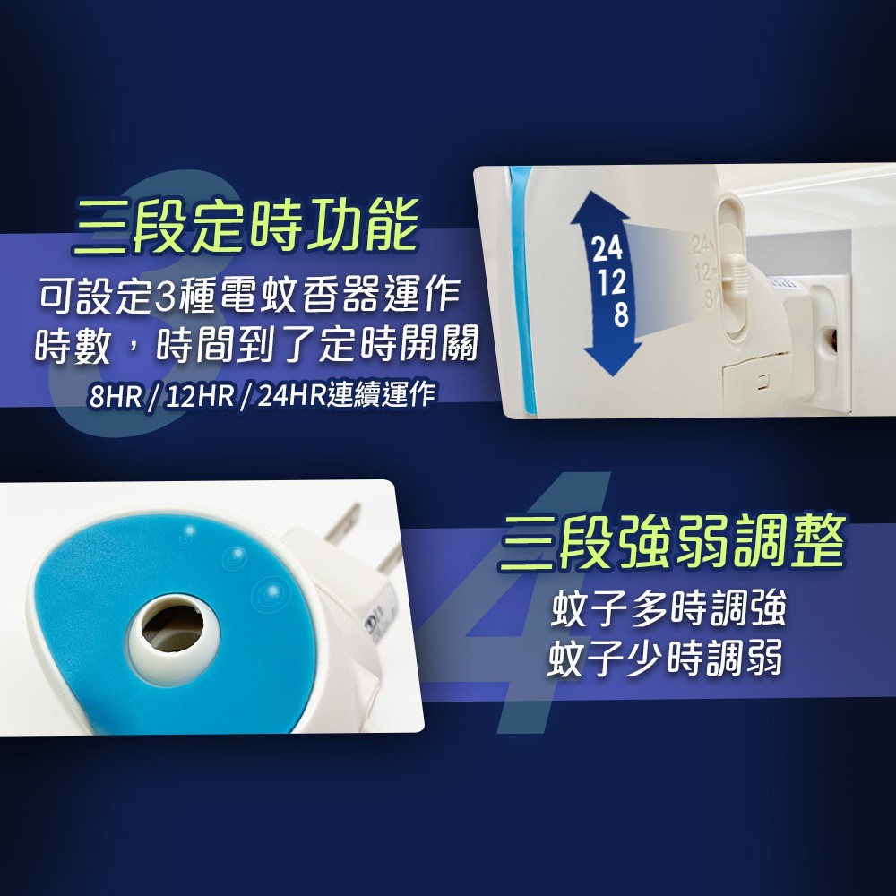- 三段定時功能,可依需求設定8/12/24小時,讓您在睡眠時也能安心防蚊,享受一夜好眠。