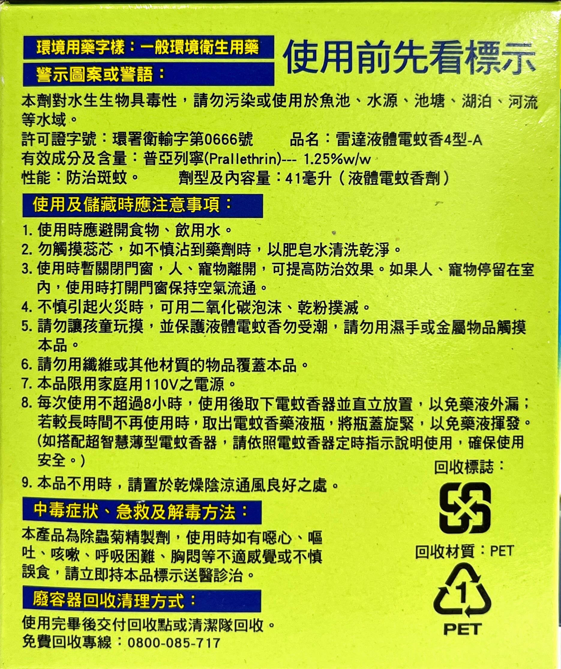 - 雷達超智慧電蚊香,植物清新配方,讓您在夏日享受清新自然的居家環境,告別蚊蟲困擾。