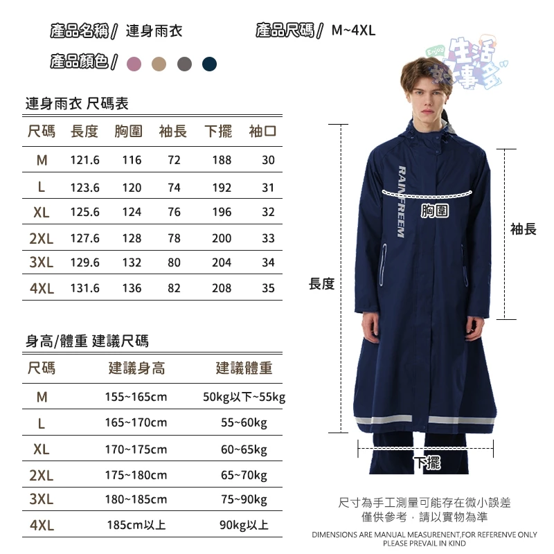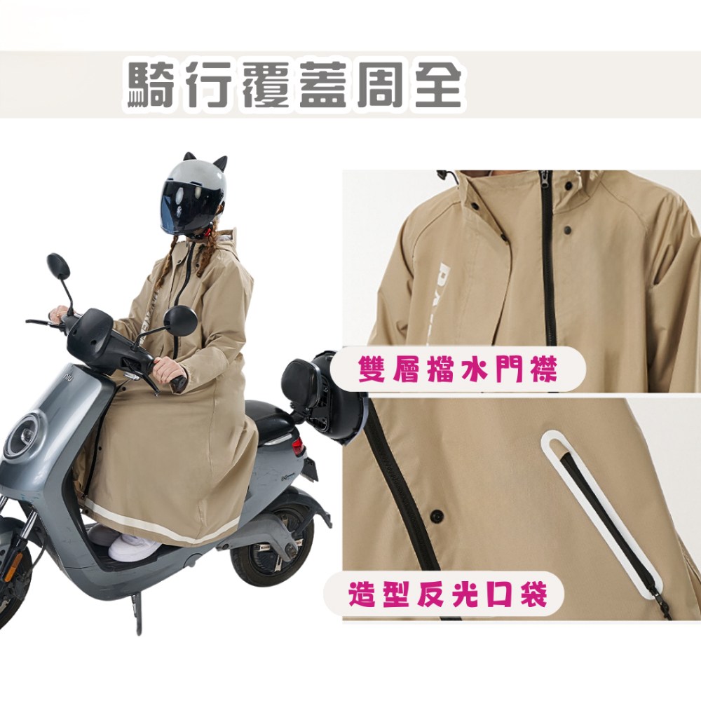 - 琴飛曼連身雨衣,採用寬鬆設計,活動自如不受限,讓您在雨中也能輕鬆騎車。