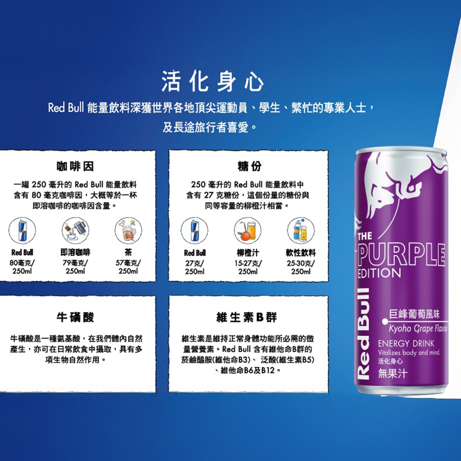 - 紅牛巨峰葡萄風味,口感清新獨特,隨時享受活力充沛的美味能量飲品。