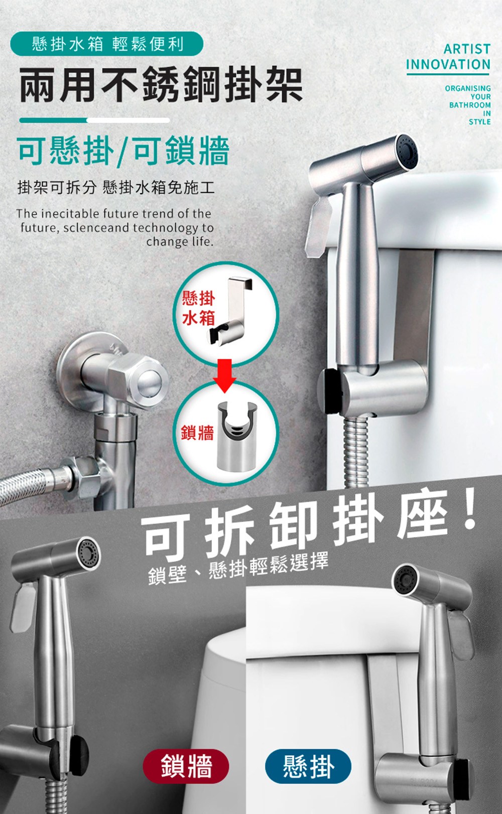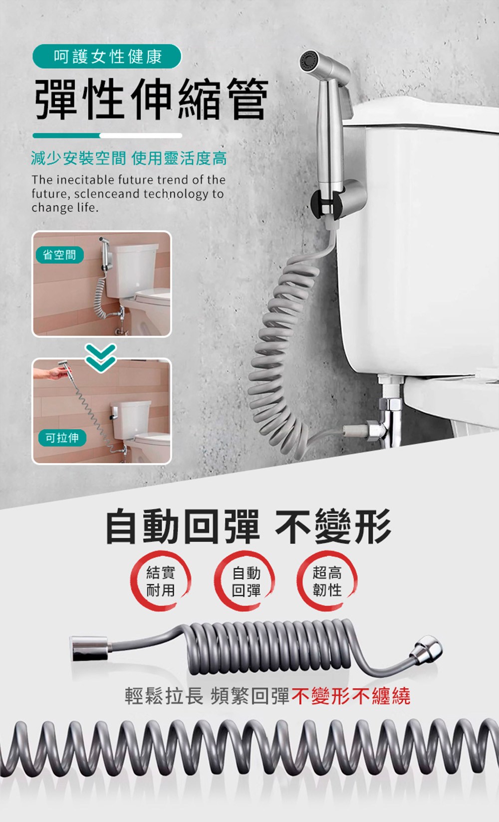- 告別空間限制,伸縮軟管設計讓您靈活運用,不再受限於固定長度,輕鬆清潔浴室各個角落,收納更方便。