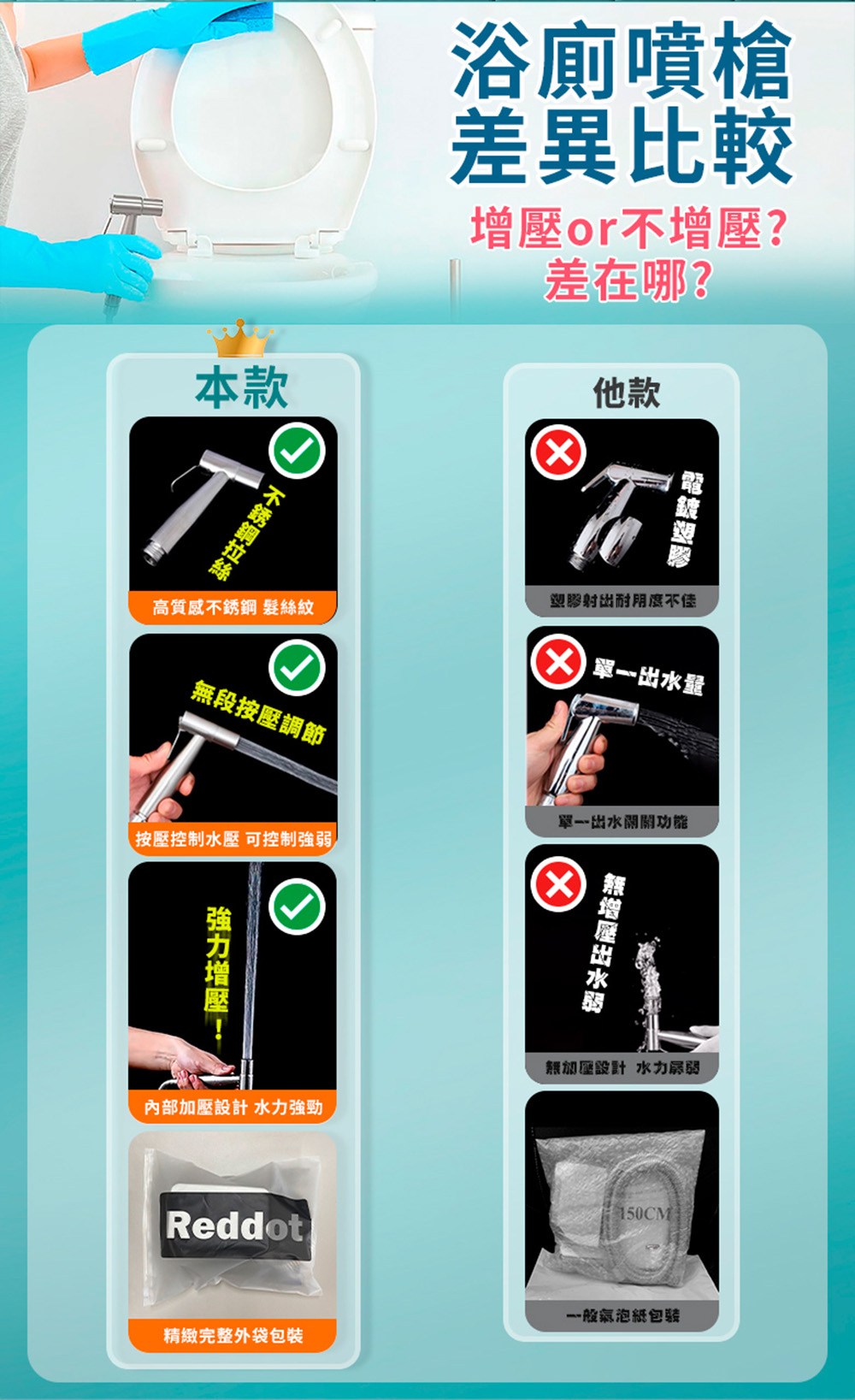 Reddot 紅點生活不鏽鋼增壓馬桶噴槍沖洗器組,為您的浴室清潔帶來革命性的改變。這款沖洗器組採用不鏽鋼噴頭和伸縮管,堅固耐用且易於清潔。其獨特的無段增壓設計,讓您隨心所欲地調節水壓,輕鬆應對各種清潔需求。附贈的馬桶掛架,更方便您收納噴槍,節省空間。無論是沖洗馬桶、清潔地板,還是呵護女性健康,這款沖洗器組都能滿足您的需求,讓您的浴室煥然一新。