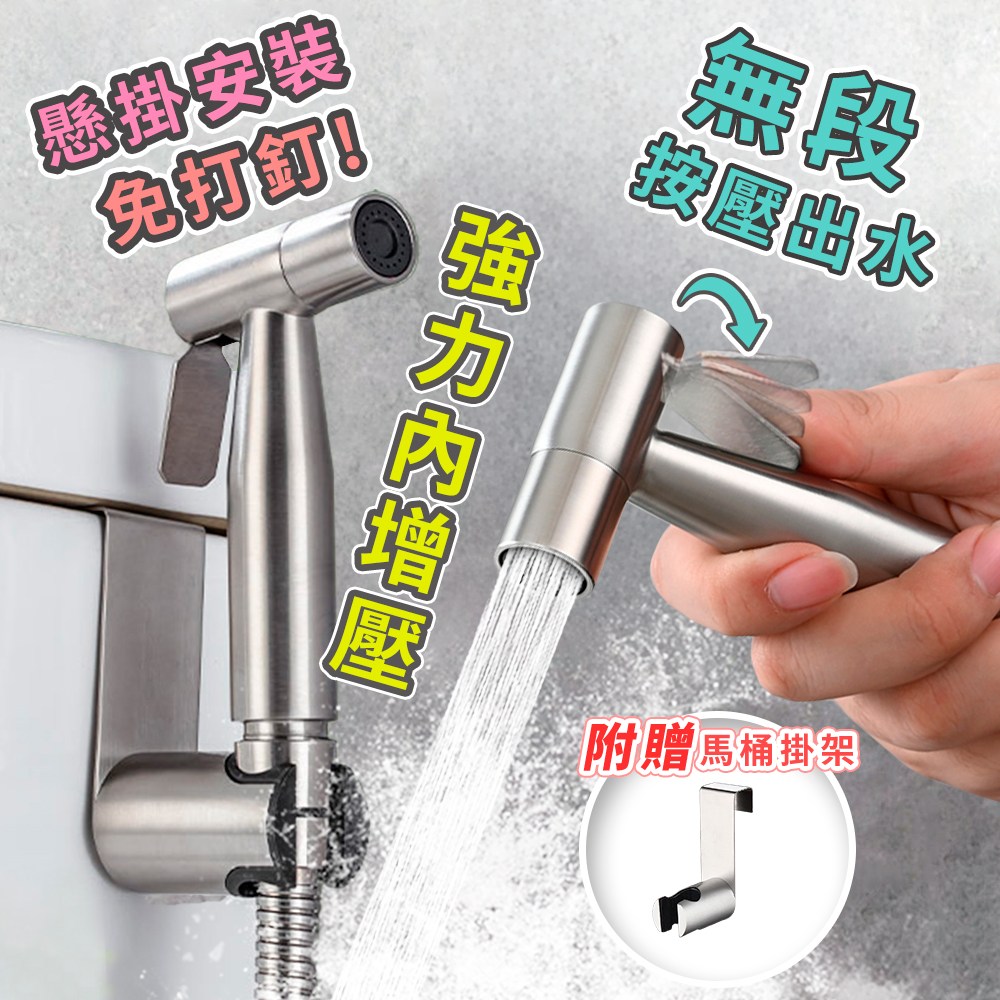 Reddot 紅點生活 不鏽鋼增壓馬桶噴槍沖洗器組 不鏽鋼噴頭伸縮管組 附馬桶掛架, 1組, 不鏽鋼 銀色
