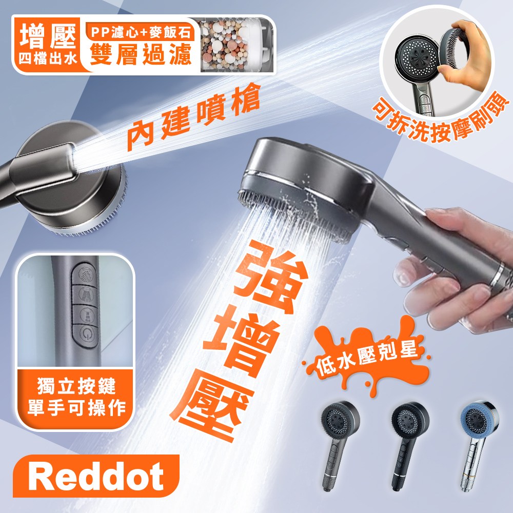 Reddot 紅點生活高質按摩過濾四檔按鍵蓮蓬頭,採用高質感金屬灰設計,簡約時尚,為您的浴室增添品味。它具有四檔水流模式,可隨心切換,滿足不同的淋浴需求。內建過濾系統,有效過濾水中雜質,讓您享受更乾淨的水源。可拆洗按摩刷頭,提供舒適的按摩體驗,舒緩疲勞。獨立按鍵設計,單手即可操作,方便快捷。