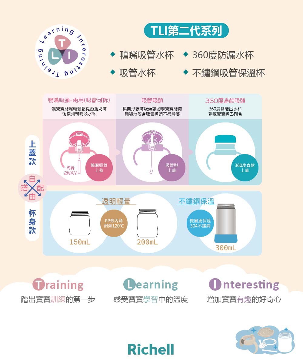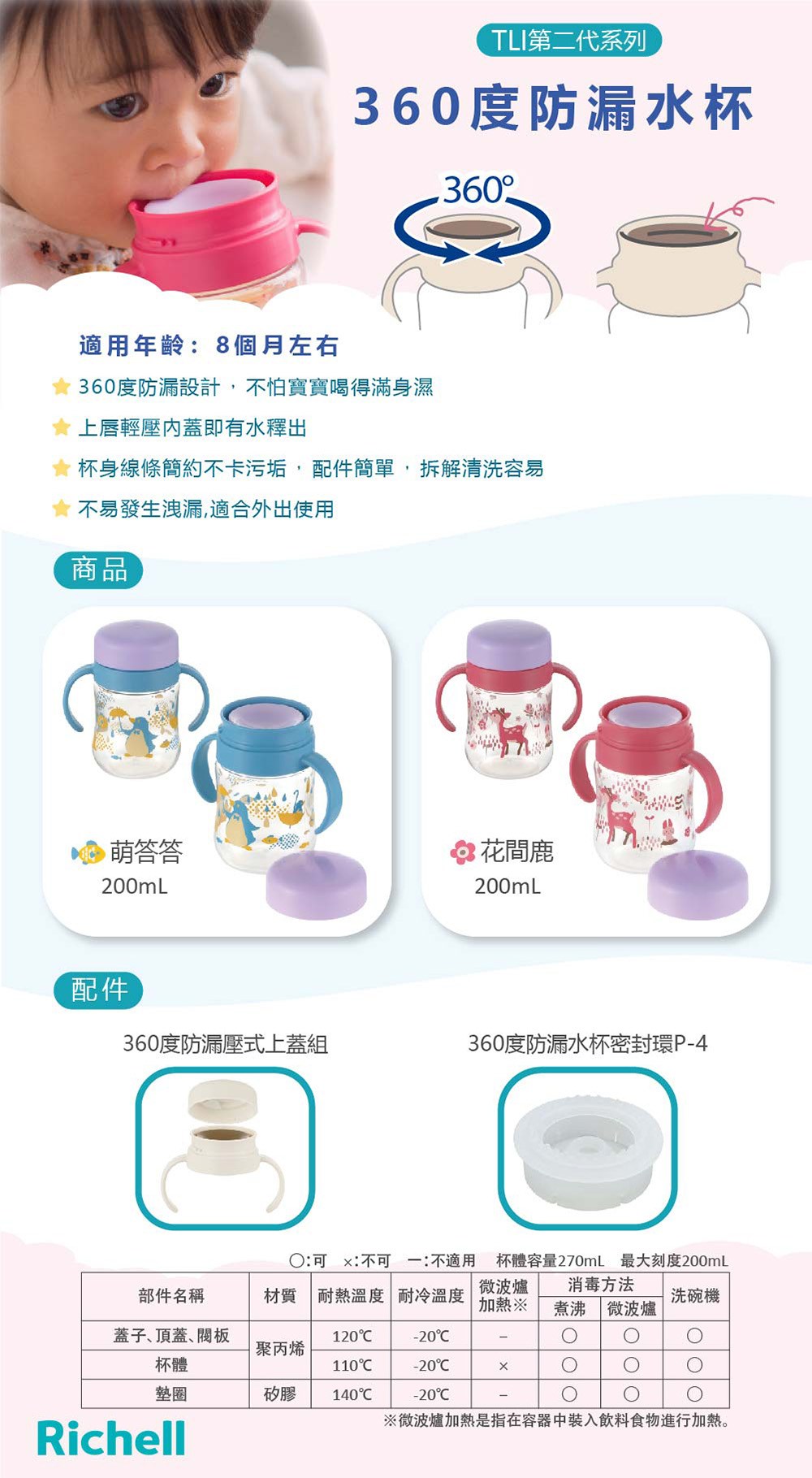 Richell 利其爾 T.L.I 系列 360度防漏水杯,專為8個月以上的寶寶設計,讓寶寶輕鬆學習飲水技巧。這款200ml的水杯採用360度防漏設計,無論寶寶從哪個角度飲用,都不易灑出,保持乾淨衛生。雙把手設計方便寶寶抓握,PP材質不含BPA,媽媽更安心。萌趣的萌答答圖案,增添寶寶飲水樂趣。清洗方便,適用於洗碗機頂層。