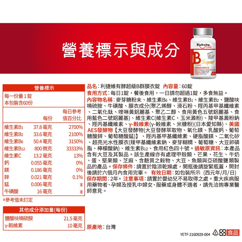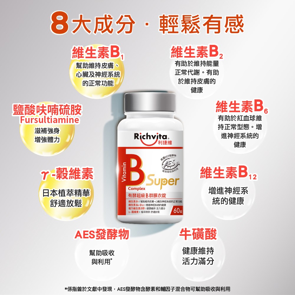 Richvita 利捷維 有酵超級B群膜衣錠,每罐包含60顆,為男女通用的保健食品。本產品主要成分為B-Complex,採用膜衣錠形式,方便吞服。有酵超級B群能幫助維持皮膚、心臟及神經系統的正常功能,並增進神經系統的健康。適合久坐或外食的人,維持身體的正常運作與健康,讓您隨時保持活力充沛。選擇Richvita,為您的健康加分。
