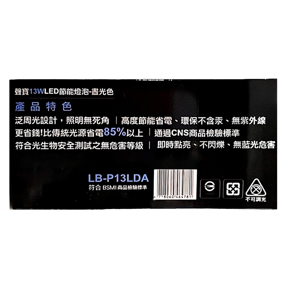 聲寶LED節能燈泡,採用13W功率,提供明亮的晝光色照明,適用於各種居家環境。這款燈泡體積輕巧,安裝簡便,能有效節省能源,降低電費支出。聲寶LED燈泡光線柔和,提供舒適的照明體驗,保護您的眼睛。選擇聲寶,享受高品質的照明,讓您的居家生活更加舒適與節能。品質可靠,使用壽命長,是您居家照明的最佳選擇。