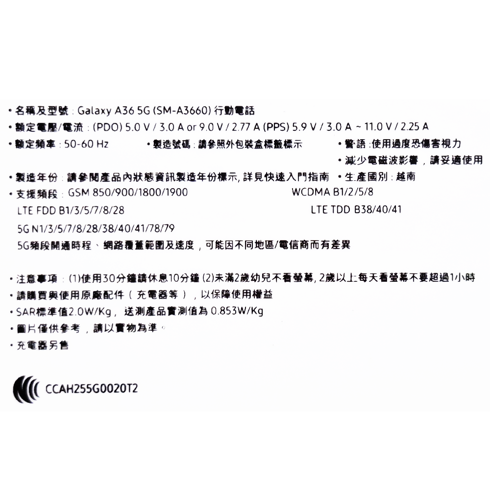 SAMSUNG 三星 Galaxy A36 5G 是一款兼具時尚外觀與強大性能的智慧型手機。秘境黑配色低調奢華,8GB記憶體與256GB儲存空間滿足日常使用需求。6.7吋大螢幕提供寬廣視野,5G高速網路讓您暢遊網路世界。原廠保固一年,品質有保障,讓您安心使用。無論是追劇、遊戲還是日常使用,Galaxy A36 5G 都能滿足您的需求。