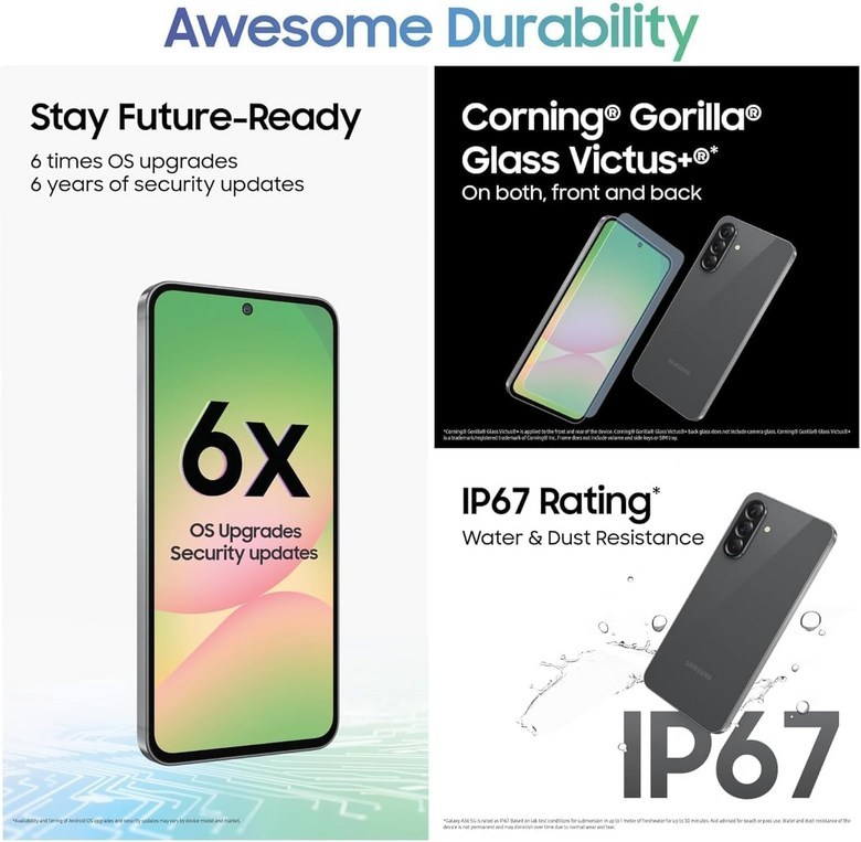 SAMSUNG 三星 Galaxy A56 是一款功能強大的智慧型手機,配備 6.7 吋大螢幕,提供寬廣的視野,讓您享受沉浸式的視覺體驗。內建 12GB 記憶體,多工處理更流暢,應用程式切換自如。搭載 256GB 儲存空間,可儲存大量的照片、影片和文件。5000mAh 大容量電池,續航力持久,滿足您一整天的使用需求。支援 5G 高速網路,讓您享受流暢的影音串流與遊戲體驗。