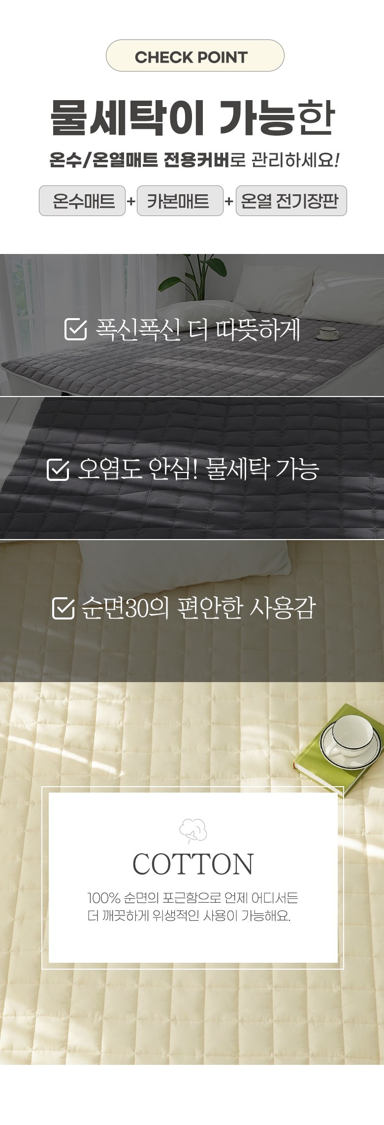 這款SCOHOme純棉溫水墊專用套,採用30支純棉材質,觸感柔軟舒適,給您帶來極佳的睡眠體驗。可水洗設計,方便您隨時保持床墊的清潔衛生,遠離塵螨困擾。L型拉鍊設計,讓您輕鬆拆裝床墊套,更換便捷。此外,本產品採用韓國產新棉填充,蓬鬆厚實,背面防滑設計,有效減少滑動,讓您享受更安穩的睡眠。讓您在寒冷的冬天也能享受溫暖舒適的睡眠。