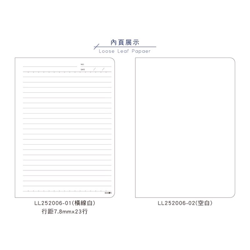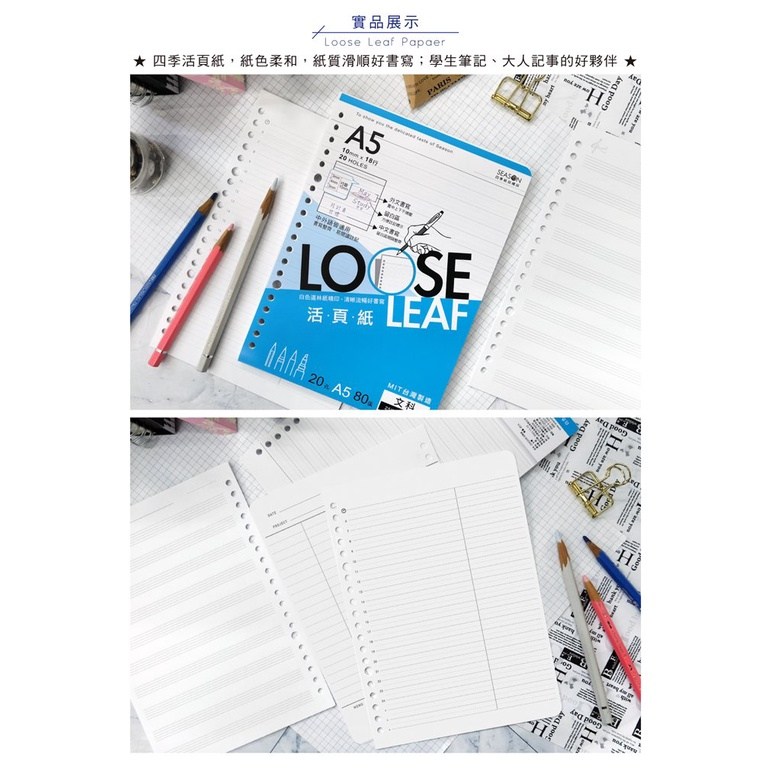 SEASON Paper&Gift 四季紙品禮品 A5活頁紙補充頁,為您的筆記本提供高品質的書寫體驗。每包含80張橫線內頁,採用優質紙張,書寫流暢不滲墨,讓您的筆記清晰整潔。標準六孔設計,適用於各種A5活頁夾,方便替換和整理。無論是學生、上班族還是創意人士,這款活頁紙都能滿足您不同的書寫需求。台灣製造,品質保證,是您學習和工作的理想選擇。